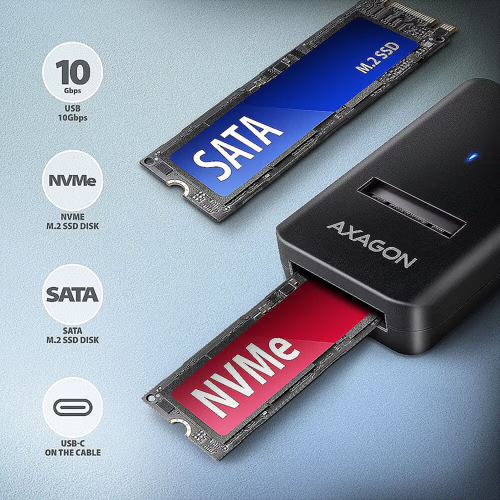 LongDesc - Compact AXAGON ADM2-CM M.2 adapter with USB 10Gbps interface designed for easy use of M.2 NVMe or SATA SSDs. Reliable connection to a computer is possible thanks to a fixed USB-C cable with a length of 10 cm.The transmission rate is up to 10Gb/s thanks to the fast USB 3.2 Gen 2 interface. The second generation of fast USB interface allows you to enjoy the speed of modern M.2 SSD drives. The universal M.2 adapter also supports other modern features such as. UASP, TRIM and enables reading S.M.A.R.T. disk status monitoring information. Standby support when idle.A unique feature, thanks to the new chipset, is the possibility of using both M.2 NVMe and SATA disks. You don't have to think about which type of M.2 drive the adapter is designed for, it simply reads all types. Another advantage of the adapter is the ability to insert the disc into the adapter slot very quickly. Changing discs is also easy. These features make the adapter a very handy and useful tool for frequent work with different types of drives. This makes it an ideal tool for testing disks, transferring, backing up and restoring data, etc.Thanks to its small size, it can be readily at hand at any time. The adapter does not prevent heat dissipation from the disk, this prolongs its lifetime and also prevents the disk from slowing down the speed of the disk, so-called. „Thermal Throttling“. This USB-C to M.2 drive adapter can be used with computers and laptops as well as mobile phones and tablets.Input:• USB 10Gbps (USB 3.2 Gen 2), connector USB-C male.• Compatible with USB 3.2 Gen 1, USB4 a Thunderbolt 3/4.Device support:• NMVe M.2 SSD disks,• SATA M.2 SSD disks, • designed for M key or B+M key card formats,• NGFF 75-pin M key slot for M.2 drives.Other features:• Supports transmission rates 10.000 / 5.000 / 480 Mbit/s.• Support of M key or B+M key NVMe (PCI-Express) and SATA (AHCI) M.2 SSDs without maximum capacity limitation.• Support for M.2 drive sizes - no length restrictions.• Support of both one-sided and double-sided M.2 SSDs.• Compliant with PCI Express Base Specification Revision 3.1a specification.• Compliant with NVM Express 1.3 specification.• Compliant with Serial ATA 3.2 specification (SATA/600), bit rates of up to 6 Gb/s (600 MB/s).• Compliant with USB Mass Storage Class specification.• The total bandwidth / transmission rate of the adapter is determined by the USB interface used (theor. 10 Gbit/s).• The real adapter bandwidth / transmission rate is about 1000 MB/s (1 GB/s), it is given by the limits of the USB 3.2 Gen 2 interface.• Supports BOT (Bulk-Only Transport).• Supports UASP (USB Attached SCSI) for faster data transmission in Windows 8 and later.• Supports TRIM functionality to limit gradual degradation of the SSD performance over time.• Supports S.M.A.R.T. (Self-Monitoring, Analysis, and Reporting Technology) system monitoring disk condition.• SSD boot support in external box.• Possibility to connect your device while running thanks to the Hot Plug support.• Full Plug and Play support.• Power supply via USB 3.0 bus up to 900mA from one USB port is sufficient in all cases.• A decent blue LED indicating the connection to the computer's USB port (permanent light) and data transmission (blinking).Other data:• Adapter dimensions 55 x 37 x 12 mm.• Adapter weight 19 g.• USB-C male cable length 10 cm.Supported operating systems:• Windows 7 / 8.1 / 10 / 11 and later, macOS, iPadOS, iOS, Linux, Chrome OS and Android.• Compatibility depends on the operating system and device manufacturer support.Package contains:• M.2 adapter with 10 cm fixed cable,• multilingual manual CZ / DE / DK / ENG / ESP / FIN / FR / GR / HR / HU / IT / NL / PL / PT / RO / SK / SWE / TR / UA / BG / CN / ARA,• packed in a cardboard box with hanging hole.