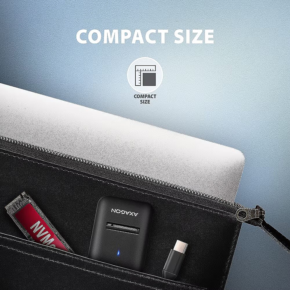 Description - ADM2-CM USB-C 10Gbps - M.2 NVMe & SATA SSD adapter USB-C 10Gbps adapter for fast connection of M.2 NVMe & SATA SSDs. USB-C cable 10 cm. Compact AXAGON ADM2-CM M.2 adapter with USB 10Gbps interface designed for easy use of M.2 NVMe or SATA SSDs. Reliable connection to a computer is possible thanks to a fixed USB-C cable with a length of 10 cm. The transmission rate is up to 10Gb/s thanks to the fast USB 3.2 Gen 2 interface. The second generation of fast USB interface allows you to enjoy the speed of modern M.2 SSD drives. The universal M.2 adapter also supports other modern features such as. UASP, TRIM and enables reading S.M.A.R.T. disk status monitoring information. Standby support when idle. A unique feature, thanks to the new chipset, is the possibility of using both M.2 NVMe and SATA disks. You don't have to think about which type of M.2 drive the adapter is designed for, it simply reads all types. Another advantage of the adapter is the ability to insert the disc into the adapter slot very quickly. Changing discs is also easy. These features make the adapter a very handy and useful tool for frequent work with different types of drives. This makes it an ideal tool for testing disks, transferring, backing up and restoring data, etc. Thanks to its small size, it can be readily at hand at any time. The adapter does not prevent heat dissipation from the disk, this prolongs its lifetime and also prevents the disk from slowing down the speed of the disk, so-called. „Thermal Throttling“. This USB-C to M.2 drive adapter can be used with computers and laptops as well as mobile phones and tablets.