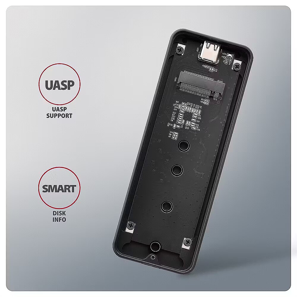 The real box bandwidth / transmission rate is about 2000 MB/s (2 GB/s), it is given by the limits of the USB 3.2 Gen 2x2 interface. Other features: