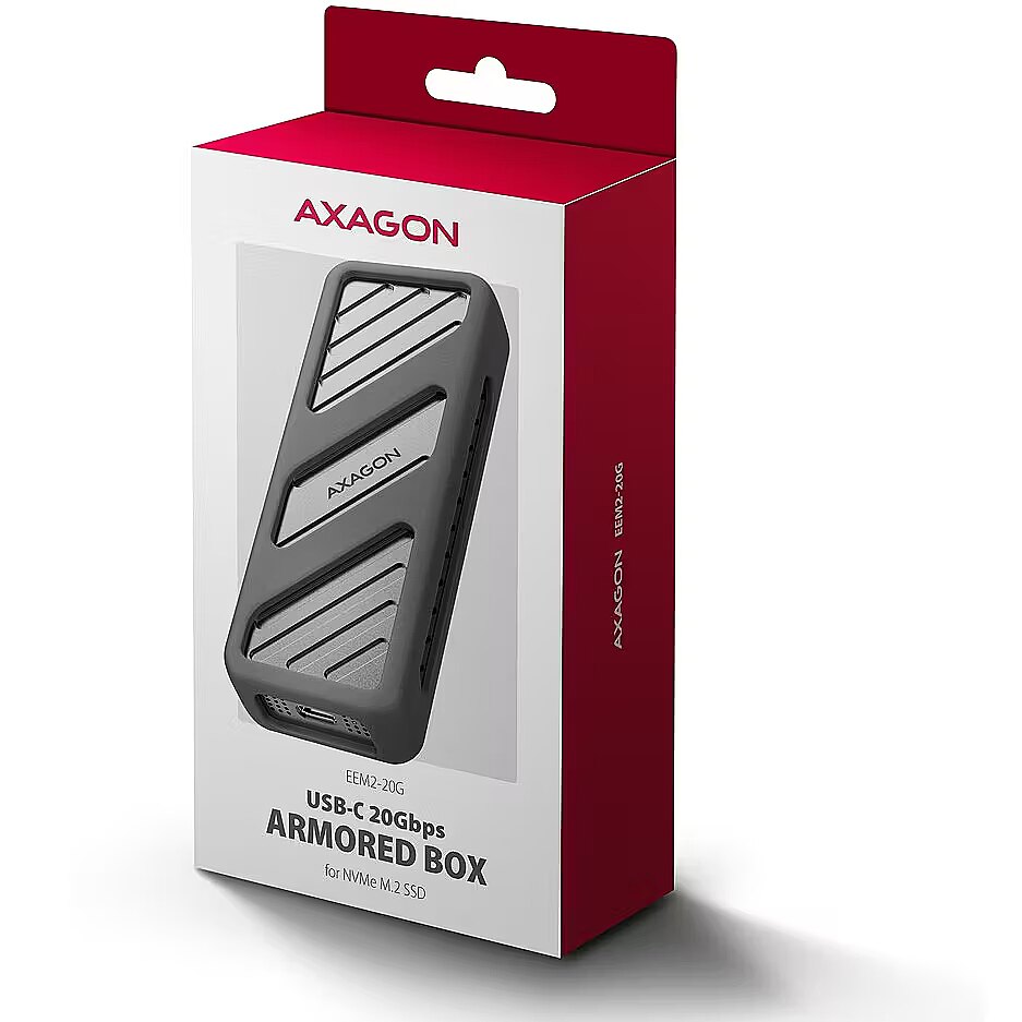Description - EEM2-20G USB-C 20Gbps - M.2 NVMe SSD ARMORED box External USB-C 20Gbps metal box for M.2 NVMe SSD disks. Fast external AXAGON EEM2-20G ARMORED box with USB 20Gbps interface for M.2 NVMe SSDs. The double-sided USB-C connector on the box enables a reliable connection. In the package you will find a USB-C -> USB-C cable to connect the box to your computer. Thanks to the USB 20Gbps interface, the transmission rate is up to 20 Gb/s. To take full advantage of the speed of the box, the controller of the connected device must be compatible with USB 3.2 Gen 2x2. These controllers are typically used in gaming laptops and modern desktop computers. The external M.2 box also supports other modern features e.g. UASP, TRIM and enables reading S.M.A.R.T. disk status monitoring information. Standby support when idle. The advantage of the box is the attachment of four different lengths of SSD cards - 30, 42, 60 and 80 mm. M.2 drives can be single-sided or double-sided. The box does not limit the capacity of inserted SSD. Opening the box via only one screw makes it easy to mount and dismount the M.2 SSD disk. Disk replacement is quick and easy, thus expanding the possibilities of using the box, e.g. for data migration, testing, etc. Aluminum box body and thermal conductive pad provides very good M.2 SSD disk cooling. Vents on the sides ensure sufficient air circulation. This extends its service life and also prevents the disk from slowing down, so-called „Thermal Throttling“. Another benefit is the silicone sleeve, which provides better protection of the box against shocks, prevents sliding on the table and ensures a comfortable grip in the hand. The outer metal housing is made in black colour with an elegant finish, that prevents unwanted fingerprints. By inserting the M.2 SSD in the box, you will easily create fast compact and universal external disk. The box can be used with computers and notebooks, as well as with mobile phones and tablets.