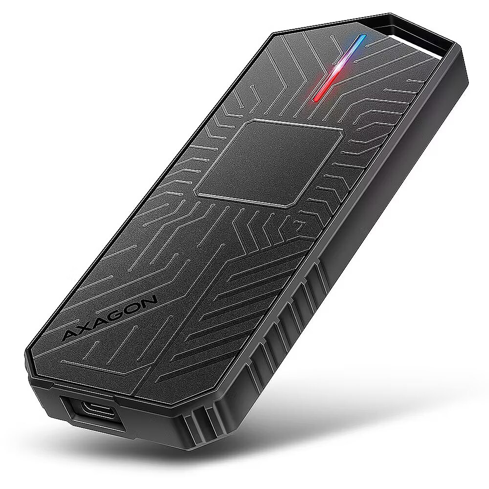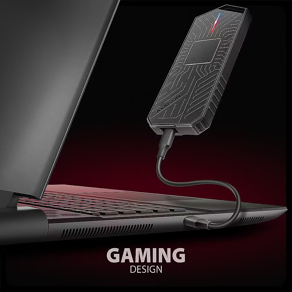 Description - Gaming external AXAGON EEM2-GAM M.2 box with USB 10Gbps interface for M.2 NVMe or SATA SSD disks. The double-sided USB-C connector on the box enables a reliable connection. In the package you will find two cables to connect the box to your computer. One USB-C USB-C and the other USB-C USB-A. You can connect the box to any free USB port on the notebook. The transmission rate is up to 10Gb/s thanks to the fast USB 3.2 Gen 2 interface. The external M.2 box also supports other modern features e.g. UASP, TRIM and enables reading S.M.A.R.T. disk status monitoring information.  A unique feature, thanks to the new chipset, is the possibility of using both M.2 NVMe and SATA disks. You don't have to think about what type of M.2 disk you put in the box. The advantage is the attachment of four different lengths of SSD cards - 30, 42, 60 and 80 mm. M.2 cards can be single-sided or double-sided. The box does not limit the capacity of inserted SSD. A great advantage is the screwless opening of the box. Just press the button on the side to release the bottom cover. Changing discs is so easy and fast. The stylish frame for M.2 drives will impress you with its premium gaming design in black with an elegant surface that will perfectly highlight your gaming setup. The RGB LED indication adds a stylish look and blends perfectly with any gaming laptop, further enhancing the atmosphere of your gaming environment.  Also included is a functional sleeve that protects the box opening button, increases overall protection, and offers a loop for hanging. Aluminum box body and thermal conductive pad provides ideal cooling for the inserted M.2 SSD. This extends the life of the disk and prevents slowing down of the disk speed, so called. Thermal Throttling. Inserting an M.2 SSD into this box easily creates a fast, compact and versatile external drive that can be used not only with PCs and laptops, but also with mobile phones and tablets.