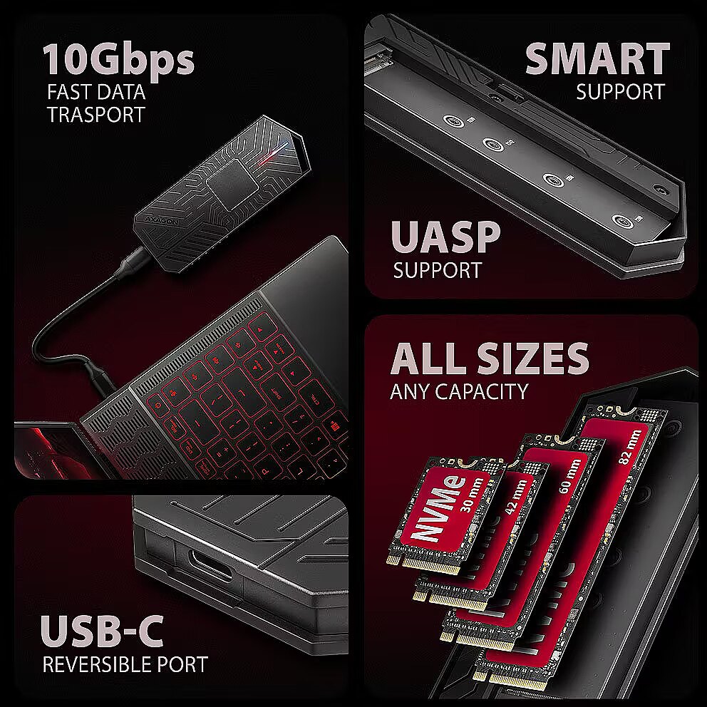 ProductDescription - AXAGON EEM2-GAM USB-C 3.2 Gen 2 10Gbps - M.2 NVMe/SATA SSD GAME 30-80mm ALU box