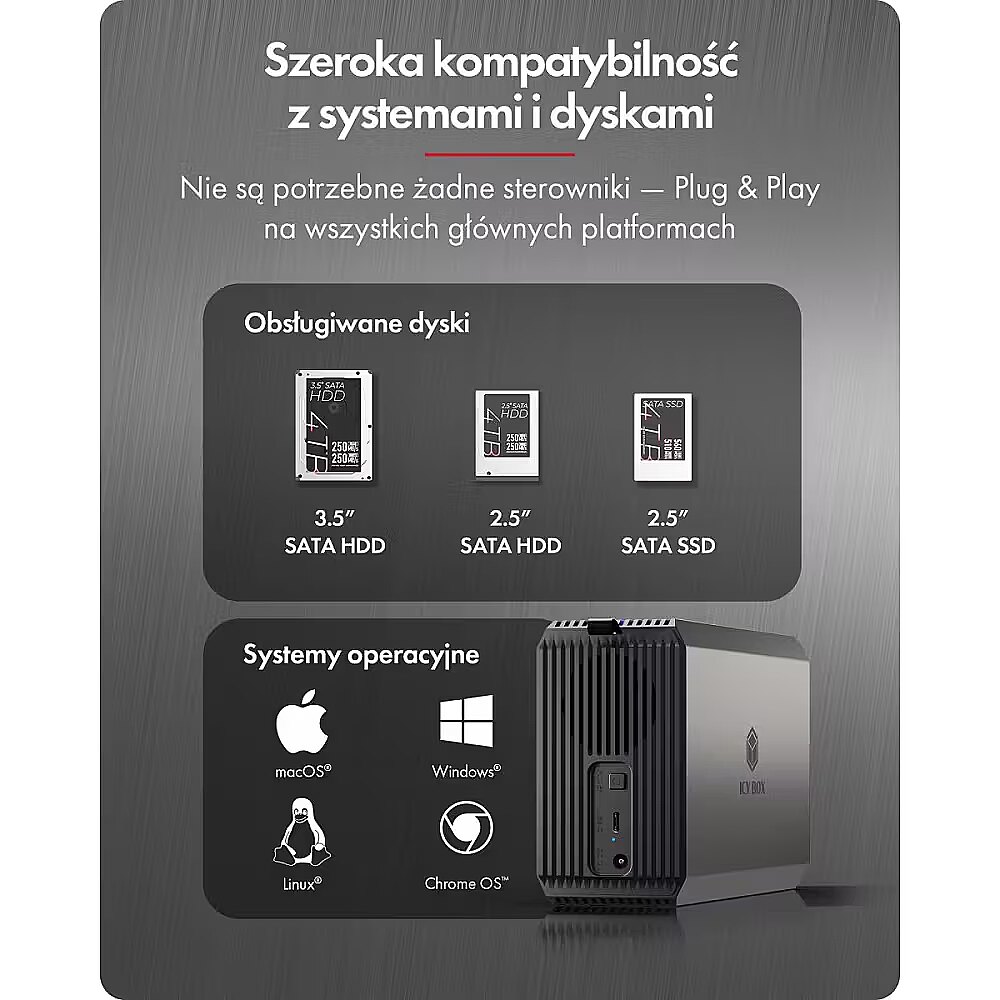 LongDesc - RAID system for 2-bay 2.5"/3.5" SATA HDD/SSD with RAID mode switchesStore it all, up to 60 TBDesigned for large-scale storage needs, this RAID system supports two 3.5" or 2.5" drives with a combined capacity of up to 60 TB. Ideal for backups, multimedia projects, and data-heavy workflows.RAID mode instructionsEasily configure your preferred RAID setup: RAID 0, RAID 1, SINGLE, or LARGE via the integrated DIP switch. Flexible options let you balance between performance and data security.Advanced heat controlEquipped with a 50x50 mm fan, the unit maintains optimal operating temperatures even under heavy workloads. This ensures stable performance and extends drive lifespan.Fast and stable 5 Gbps performanceThe USB 3.2 Gen 1 Type-C® interface delivers transfer speeds of up to 5 Gbps. Perfect for handling large files quickly and reliably.Wide system & drive compatibilityCompatible with both 2.5" and 3.5" SATA HDDs or SSDs, and supports SATA III with backward compatibility for SATA II drives. Works seamlessly across different setups and operating systems.Ready to use, all accessories includedComes complete with a power adapter, cables, and everything needed for setup. Ready to run right out of the box for immediate data access.Double the bays, double the choiceWith room for 2 drives, the IB-RD3720-CU3 is designed to work with both 2.5" and 3.5" HDDs or SSDs, giving you the freedom to mix and match based on your storage needs. Whether you prefer the compact size of 2.5" drives or the larger capacity of 3.5", installation is straightforward and convenient.Connect fast, work fasterWith its USB 3.2 Gen 1 Type-C® connection, this RAID system keeps data moving at speeds of up to 5 Gbps. That means large video files, photo libraries, or project backups transfer quickly without long waits. USB Type-C® is compatible with a wide range of modern notebooks, desktops, and devices, so you spend less time worrying about cables and enjoy more time focusing on your work or entertainment. Switch it your wayThe built-in DIP switch makes it simple to choose how your storage works for you. With just a flick, you can select between 4 modes: RAID 0 for faster access, RAID 1 for reliable backup, SINGLE for independent drives, or LARGE to combine capacity into one big volume. There’s no complicated setup and you can adapt the system to different projects, balancing performance and protection depending on what matters most.