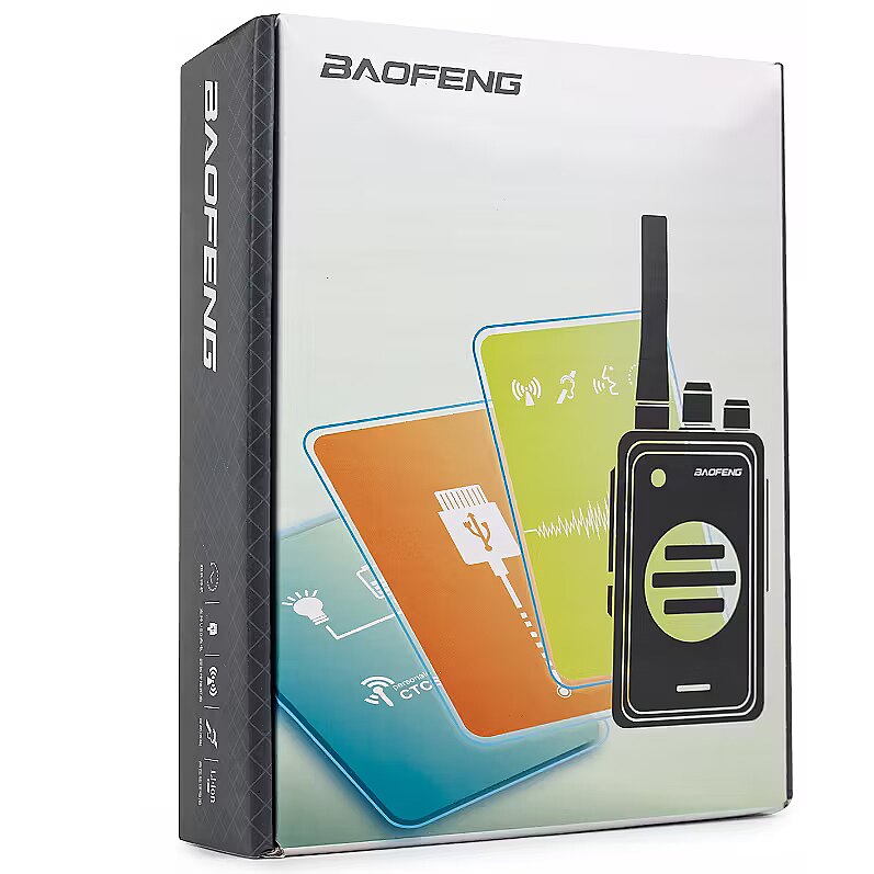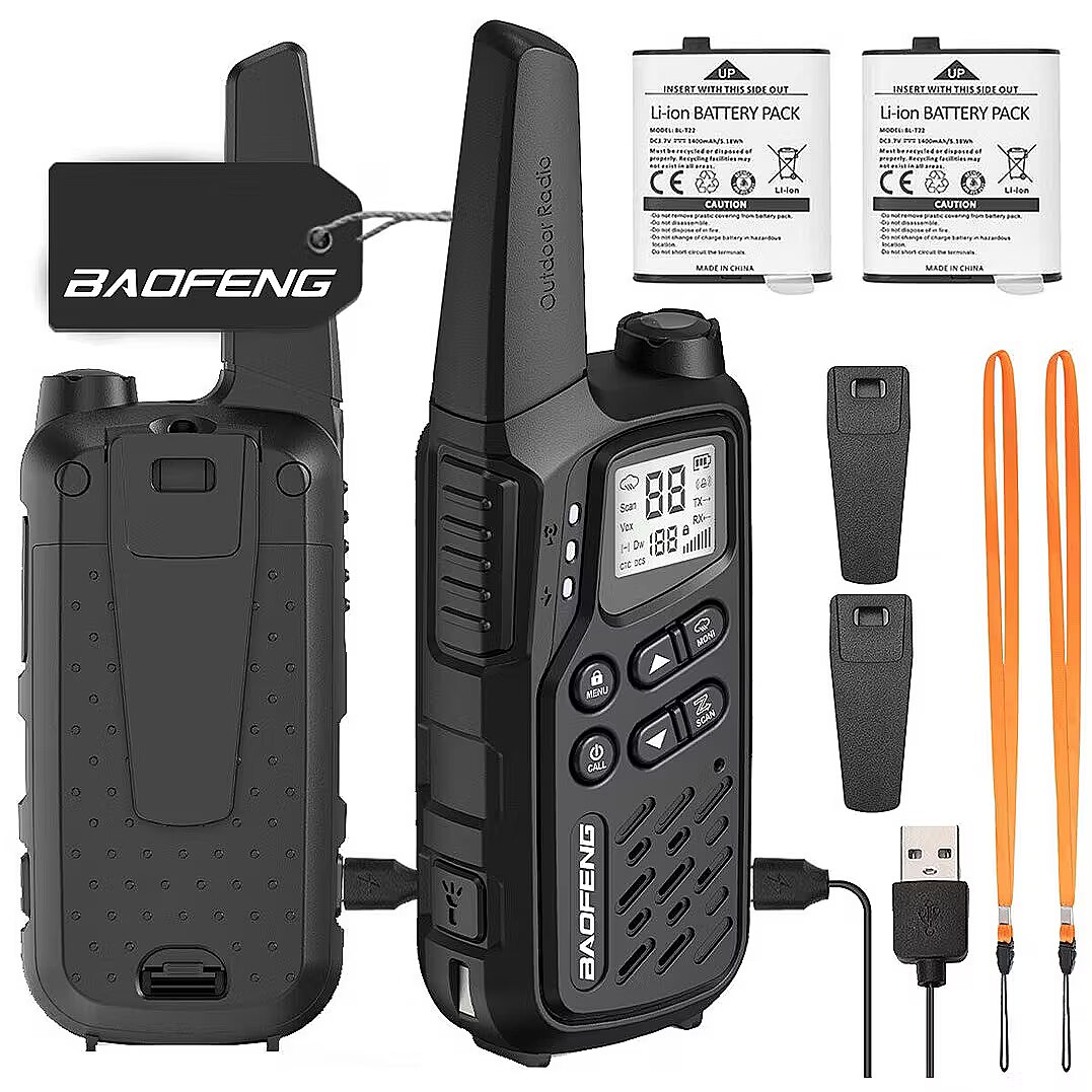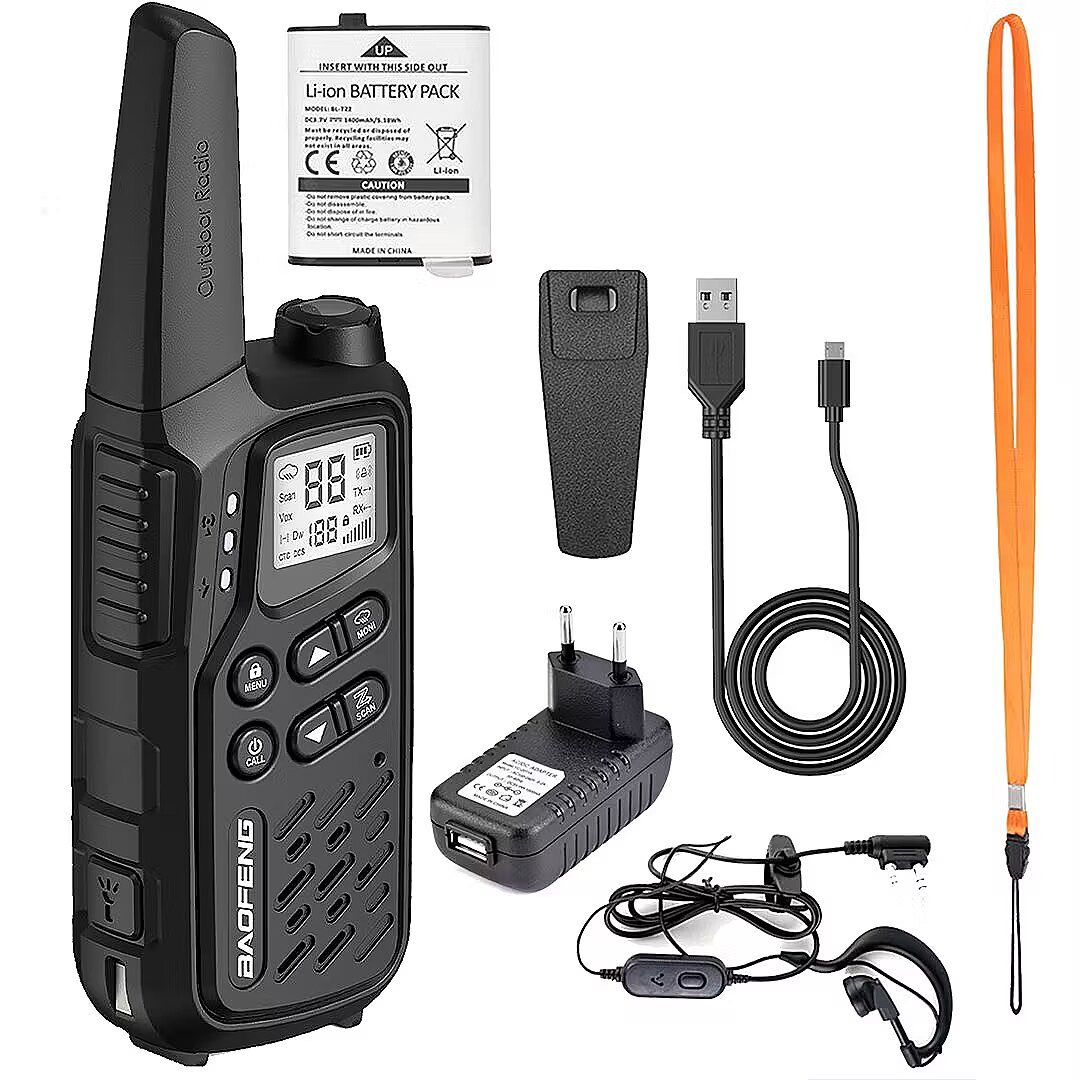Packaging content - Set contents - 2x PMR Radio Baofeng BF-T25,2x 3,7V 1400mAh battery, 2x PTT-1,1x AC adapter (EU) 230V/USB, 1x USB charging cable, 2x lanyard