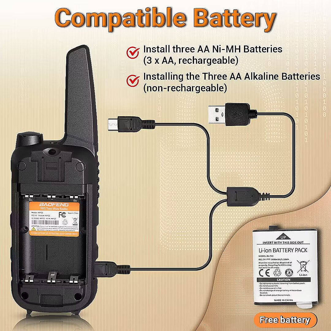 Packaging content - Set contents - 2x PMR Radio Baofeng BF-T25,2x 3,7V 1400mAh battery, 2x PTT-1,1x AC adapter (EU) 230V/USB, 1x USB charging cable, 2x lanyard