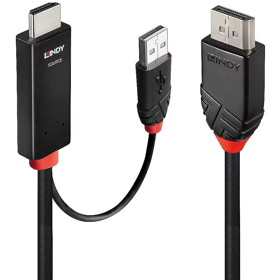 Technical_details - The HDMI > DisplayPort adapter cable 41500 from Lindy combines a slim, modern design with high performance and high-quality conversion of HDMI signals for output on a DisplayPort monitor. The active cable has a chipset in the HDMI connector that ensures a consistently secure, reliable connection between HDMI media players, game consoles or PCs and the DisplayPort monitor. With resolutions of up to 4,096 x 2,160@ 60Hz, the cable supports a demanding working environment as well as an immersive gaming experience. The uncompressed multi-channel audio ensures impressive 3D surround sound performance, ideally complementing detailed videos. The additional USB-A plug can optionally be used for power supply. Item no.: 1856616 Type cable Color black/red EAN 4002888415002 Manufacturer no. 41500 Application example For connecting a DisplayPort monitor to an HDMI interface Audio / Video area Connection of 1x USB-A (male), 1x HDMI (male) to 1x DisplayPort (plug) HDMI 2.0 protocol Video classification Displayport 1.2 Cable cross section 30 AWG Taps 3 Properties external Feature Gold-coated pins, High Dynamic Range support ensures deeper blacks, brighter whites and a wider color spectrum Further information Supported bandwidth 21.6 GB/s, maximum resolution 4096 x 2160@ 60Hz 4:4:4 8Bit (4096 x 2160@ 60Hz 4:2:2 12Bit with HDR) Cable length 3 meters