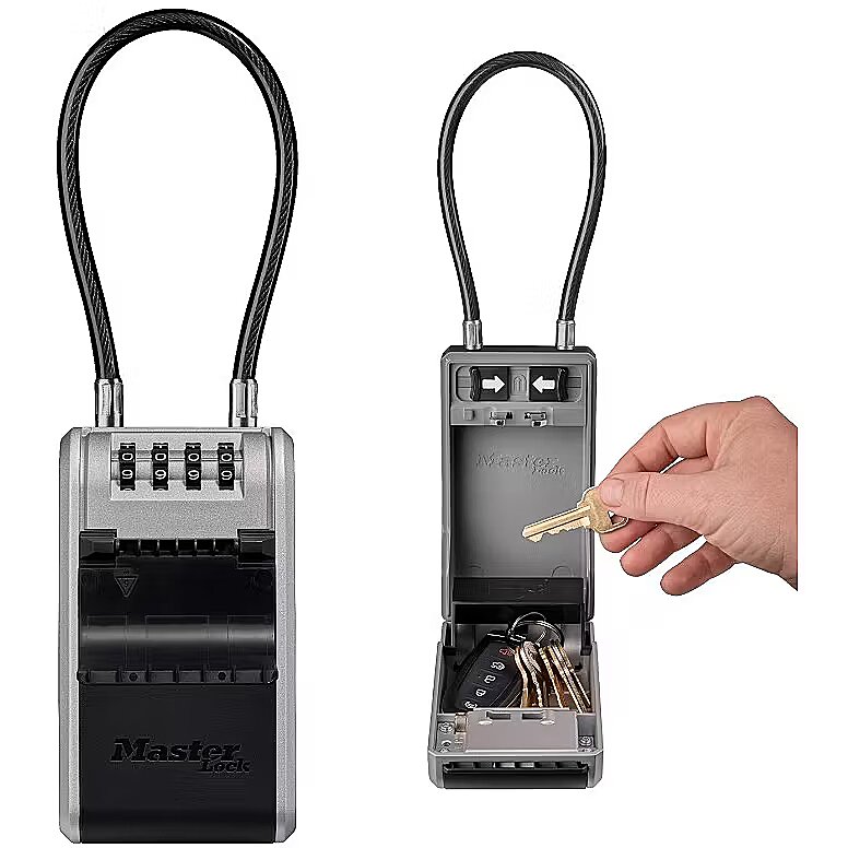Description - Experience the innovation of shared access with a combination lock key box with a flexible cable shackle. Master Lock 5482EURD Select Access with flexible cable shackle. This key box changes the way you secure and share access to your property, from your home or business to your boat or vehicle, offering unparalleled installation flexibility. With state-of-the-art features and benefits, the Master Lock 5482EURD Select Access redefines security and versatility. Product Features: Sturdy construction with a durable metal body for better resistance to attacks Increased capacity to safely store up to 10 keys (fobs, cards and large keys) Integrated container neatly secures items to prevent jamming when closing the door 4-LED combination custom settings with large dials that are easy to read, hold and turn Quick and easy access with a quick, one-step opening operation Durable, weatherproof cover protects against the elements Flexible 34 cm x 8 mm diameter cable for easy placement in a wide range of locations, the cable can be easily attached anywhere For added security, consider installing the box in a discreet location Limited Lifetime Warranty