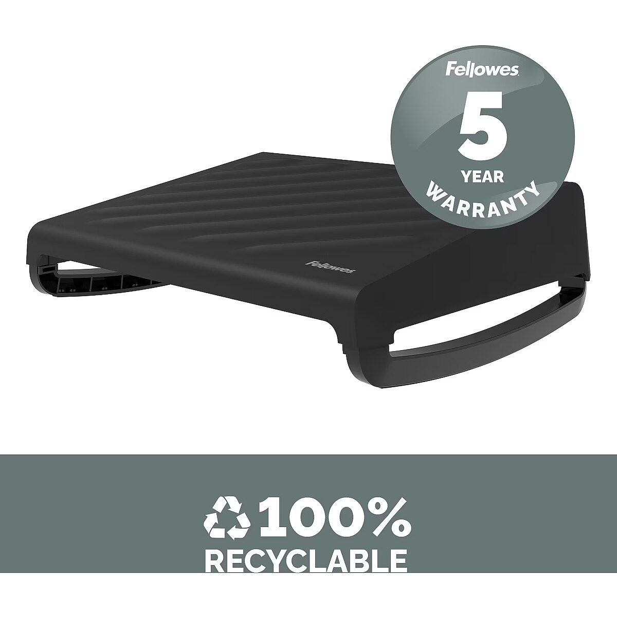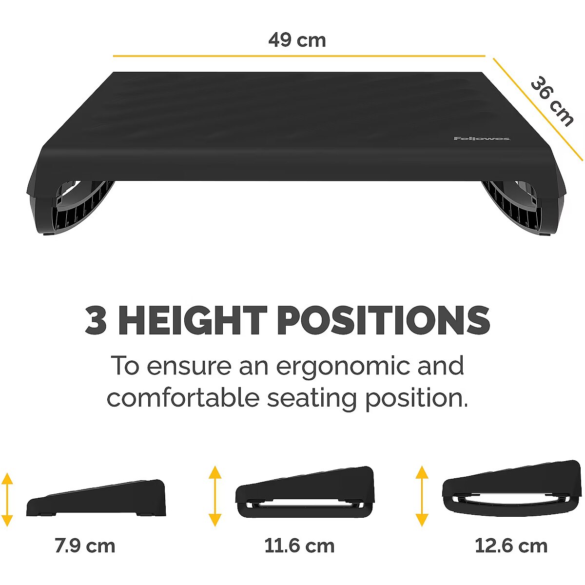 LongSummaryDescription - Fellowes Foot Rest Under Desk - Breyta Foot Support Ergonomic Foot Rest with Textured Surface - Foot Rest Stool for Office & Home - Black. Product colour: Black, Material: ABS, Tilt angle range: 0 - 18°. Platform width: 49 cm, Platform depth: 36 cm, Width: 490 mm. Package width: 515 mm, Package depth: 112 mm, Package height: 394 mm. Warranty period: 5 year(s)