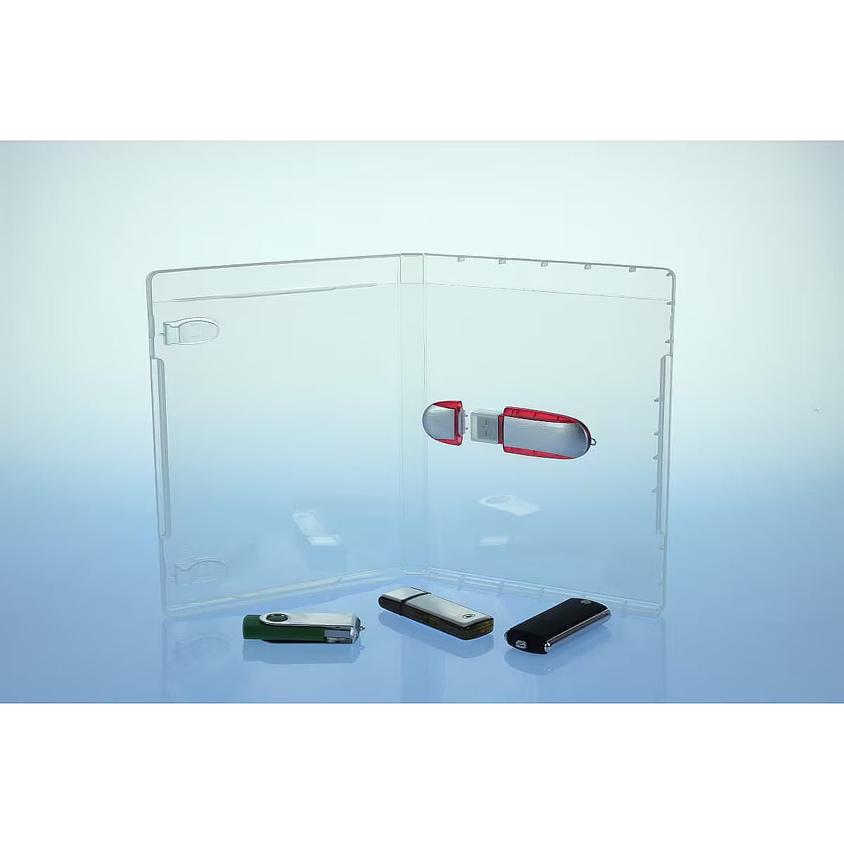 description_short_en - Case for one USB flash drive Made of transparent durable plastic Clips for attaching the pamphlet Slim design – 14 mm