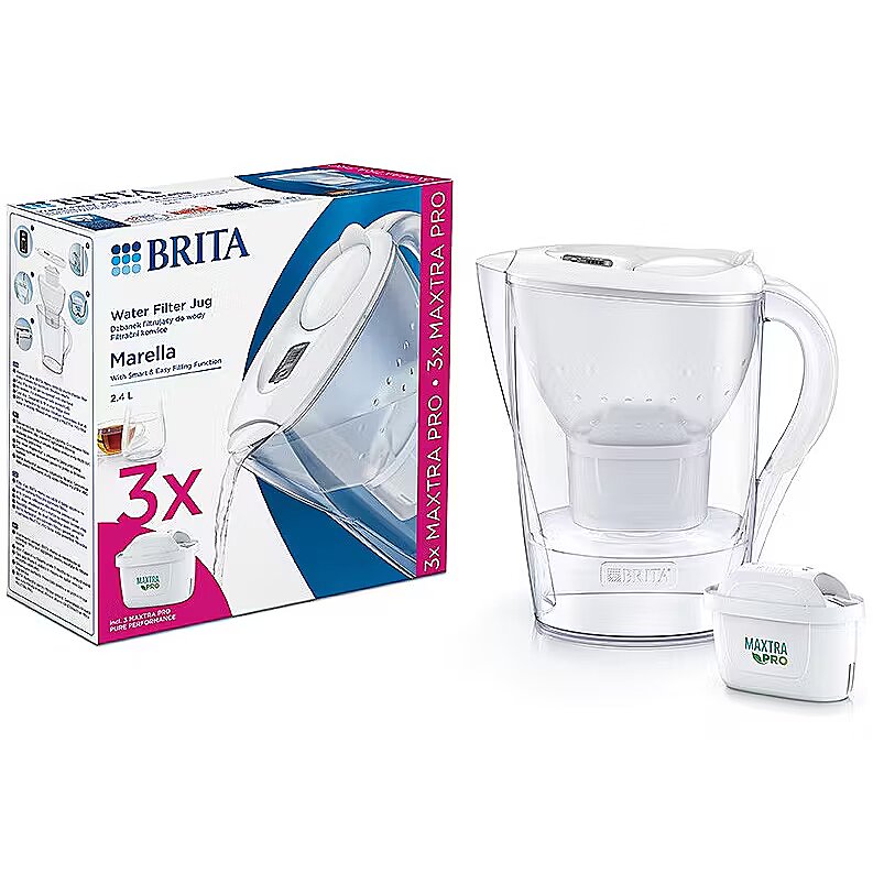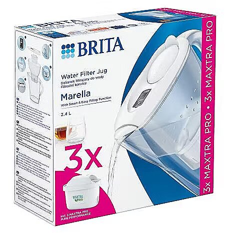 Description - BRITA Marella white MAXTRA PRO Pure Performance filter jug The perfect filter jug for your family The BRITA Marella water filter jug is the best solution for household members. Thanks to it, you will be able to drink cleaner, freshly filtered water every day. You will forget about expensive bottled drinks, and taking care of regular hydration of the body will become even easier! Constant access to fresh, filtered drinking water. Better taste of prepared dishes and drinks. Less limescale in the kettle and coffee machine. Easy filling system and reminder to replace the cartridge. Great savings - filtered water is only a dozen or so grams/liter. Convenience and functionality The BRITA water filter jug has been designed so that you can use it comfortably every day. It is a very ergonomic and functional device that should be in every kitchen. Large capacity of 2.4 liters in total, 1.4 liters of filtered water. Easy to fill: the lid with a hinged flap can be opened with one hand. It is dishwasher safe (except for the lid with an electronic indicator). BRITA Memo indicator, which reminds you to change the filter every 4 weeks. The jug fits perfectly on the shelf in the refrigerator door. Fine filtration Thanks to the advanced MAXTRA PRO Pure Performance water filter with innovative BRITA MicroFlow technology, the jug ensures unparalleled water purity, regardless of its hardness. Whether you want hot coffee or cold lemonade, you can enjoy clean, fresh water at any time of day. With this filter, you will discover the true taste of water that will delight your taste buds. The MAXTRA PRO Pure Performance filter is sufficient to filter 150 litres of water. How does the BRITA MAXTRA PRO Pure Performance filter work? Filtration through BRITA MAXTRA PRO Pure Performance is a 4-step process: 1. Super-fine mesh: captures large particles from old water pipes, e.g. sand or rust. 2. Natural activated carbon beads, made from coconuts, prevent chlorine and its derivatives from getting into the filtered water, as well as trace contaminants such as herbicides, pesticides and pharmaceutical residues (if present in tap water) 3. Ion exchanger beads reduce metals: e.g. lead and copper and soften the water. 4. Additional high-performance filter mesh means 4x better impurity retention compared to the previous MAXTRA+ filter (particle size 30 m) In addition, the PerfectFit mechanism ensures that all water is thoroughly filtered when using original BRITA cartridges. Enrich your kitchen The BRITA Marella water filter jug will change your kitchen for the better! Not only will you rediscover the taste of purified tap water, but you will also prepare tastier hot and cold drinks. Coffee will regain its deep aroma, and tea will be clear and transparent. Thanks to the use of tasty, filtered water, the dishes you prepare will be even better and healthier for you and your family. Design in 3 colors Do you love colors? We do too! That is why BRITA Marella is available in 3 unique colors, thanks to which you can adjust the jug to your preferences and perfectly fit it into the style of your kitchen. You can choose deep graphite, energetic blue or pure white. The BRITA water filter jug is not only high quality, but also a modern design that will appeal to everyone. Safety included All BRITA products, including filter jugs, have received a positive PZH Hygiene Certificate. Thanks to the fact that they have been thoroughly tested, you can be sure that you are using safe water filters. Every sip of water from a BRITA jug is a healthy and tasty refreshment for you and your family. Choose BRITA filter jugs and protect the planet By choosing filter jugs, you protect the environment. With constant access to clean, freshly filtered water, you will forget about heavy cases of bottles. You will reduce the amount of plastic waste thrown away, and as a result - you will join the protection of our planet. Take care of the environment with us.