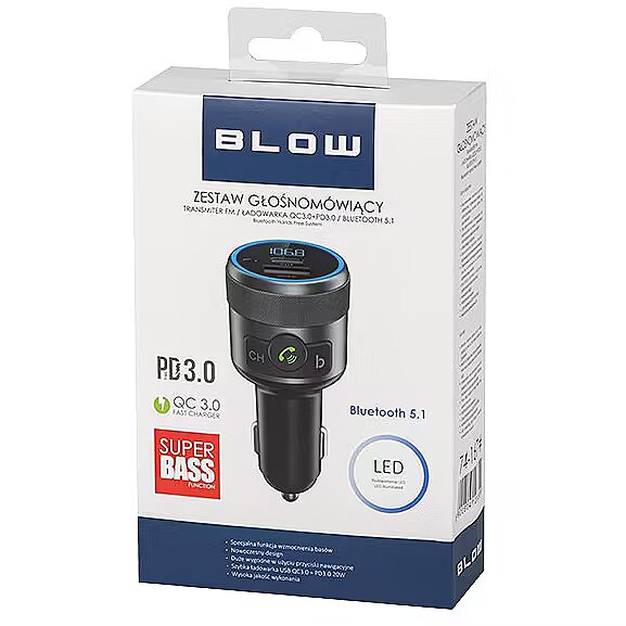 Description - FM Transmitter Bluetooth5.1 + QC3.0 + PD 24W High-quality multifunctional hands-free kit with FM transmitter function and USB charger. The product increases the functionality of even the simplest radio in the car, thus improving the comfort of traveling. With this device, you can also play music via your phone or any other device with Bluetooth function. Key features: Wireless transmission of phone conversation and audio playback to the car FM stereo system via Bluetooth Hands-free mode automatically switching from music playback status when receiving calls Advanced bass enhancement technology activated by the appropriate button External, specialized high-quality microphone significantly improving sound capture Modern design with LED backlight Charger function with 2 charging ports (QC 3.0 + PD 3.0) Multifunction knob Ability to activate the assistant (using the smartphone function) The latest Bluetooth 5.1 technology
