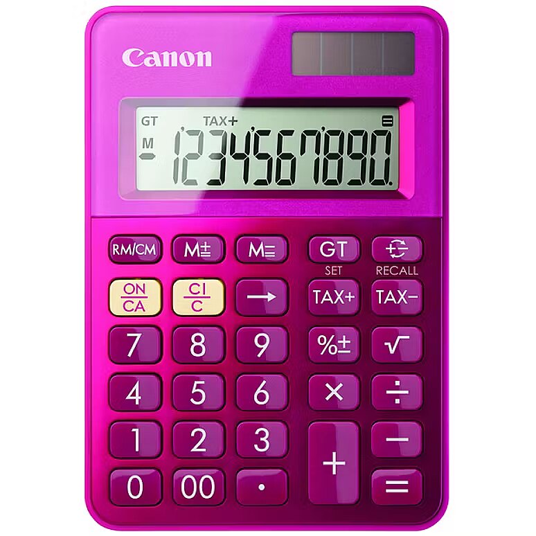 LongSummaryDescription - Canon LS-100K. Form factor: Desktop, Type: Basic. Digits: 10 digits, Display number of lines: 1 lines. Tax calculation. Power source: Battery/Solar. Product colour: Pink