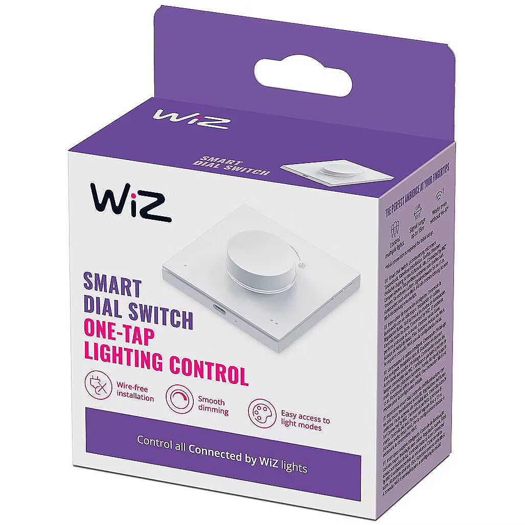 LongSummaryDescription - WiZ Smart Dial Switch. Connectivity technology: Wireless, Wireless technology: Wi-Fi, Product colour: White. Power source: Battery, AC input voltage: 5 V, Input voltage: 5 V. Width: 86 mm, Depth: 86 mm, Height: 24.9 mm. Package width: 106 mm, Package depth: 61 mm, Package height: 137 mm. Net weight: 100 g