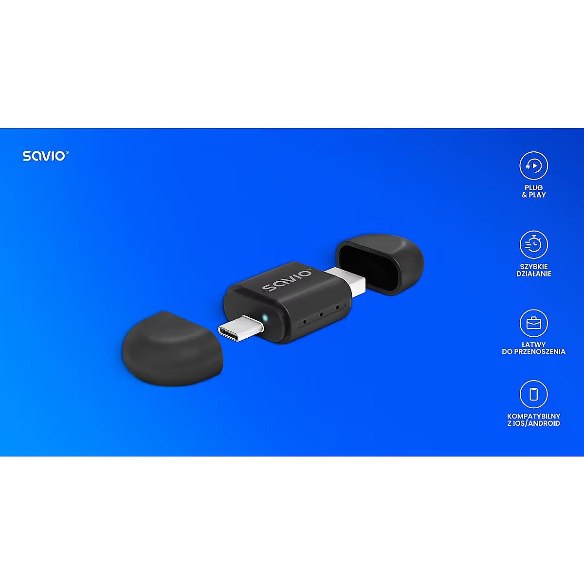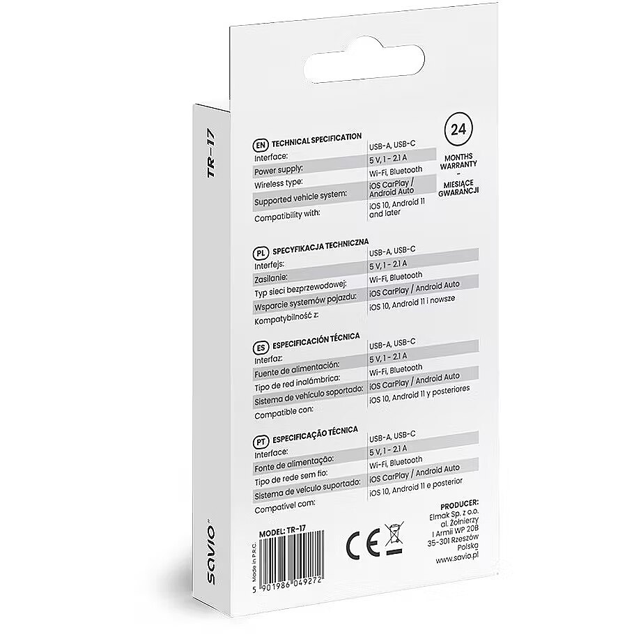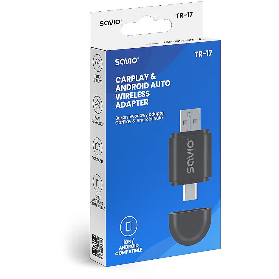 Easy Installation and Universal Connection The Savio TR-17 wireless adapter is an innovative solution that allows you to use Apple CarPlay and Android Auto without the need for cables. With this device, you can fully integrate your smartphone with your cars multimedia system in a simple and convenient way. The TR-17 adapter eliminates the need to connect your phone via a cable. Thanks to built-in Wi-Fi and Bluetooth modules, synchronization between your smartphone and the car system is fast and stable. This solution provides greater freedom and enhances the aesthetic of your cars interior by eliminating tangled cables. The device supports Apple CarPlay (iOS 10 and later) and Android Auto (Android 11 and later), making it an ideal choice for both iPhone and Android smartphone users. With the TR-17, you can use navigation, play music, and make hands-free calls completely wirelessly. The adapter is equipped with USB-A and USB-C ports, ensuring seamless connection to most car multimedia systems. Installation is extremely simple just plug the device into the car's USB port and pair it with your smartphone.