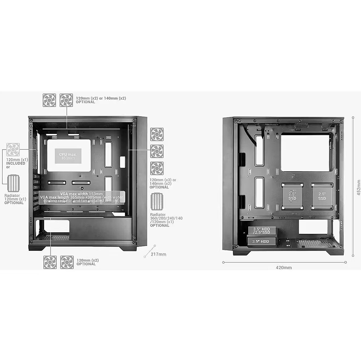 Cooling - Front fans diameters supported - 120,140 mm