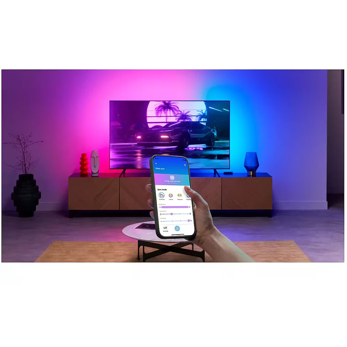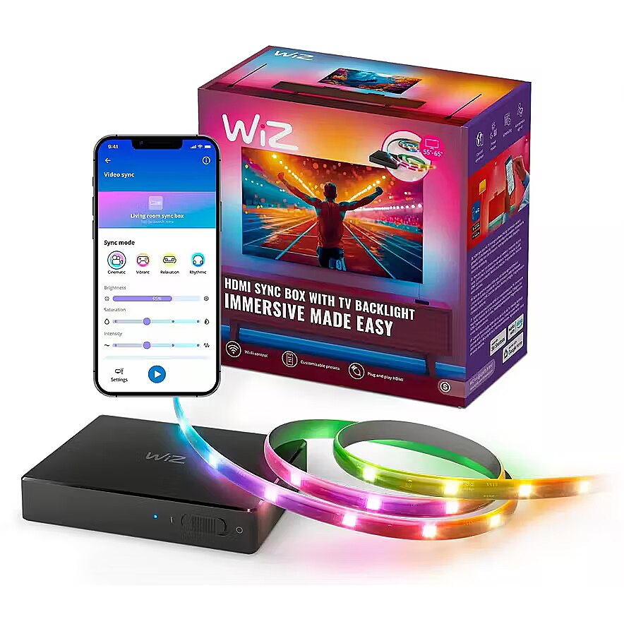 LongDescription EN - Transform your entertainment spaceThe HDMI Sync Box with RGBIC backlight for 55"–65" TVs elevates movies, games, and music by projecting your TV screen’s colours into the room in real time. Colours are matched precisely by analysing the HDMI signal, without the need for a camera or complicated calibration. Wide compatibility and premium qualitySupports 4K resolution at 60 Hz, HDR10+, and Dolby Vision, and works with any HDMI 2.0 device such as gaming consoles, streaming sticks, or set-top boxes. Full-room WiZ light syncConnect WiZ colour lights to create a complete lighting setup, whether you’re using bulbs, LED strips, or lamps, for a fully immersive ambience. Music mode with built-in microphoneEven with the TV off, lights can pulse to the beat of your music, making it perfect for parties or relaxation. Customisable controlUse the WiZ app to select pre-set modeslike Cinematic or Relaxation, or customise brightness and colours to suit your mood.