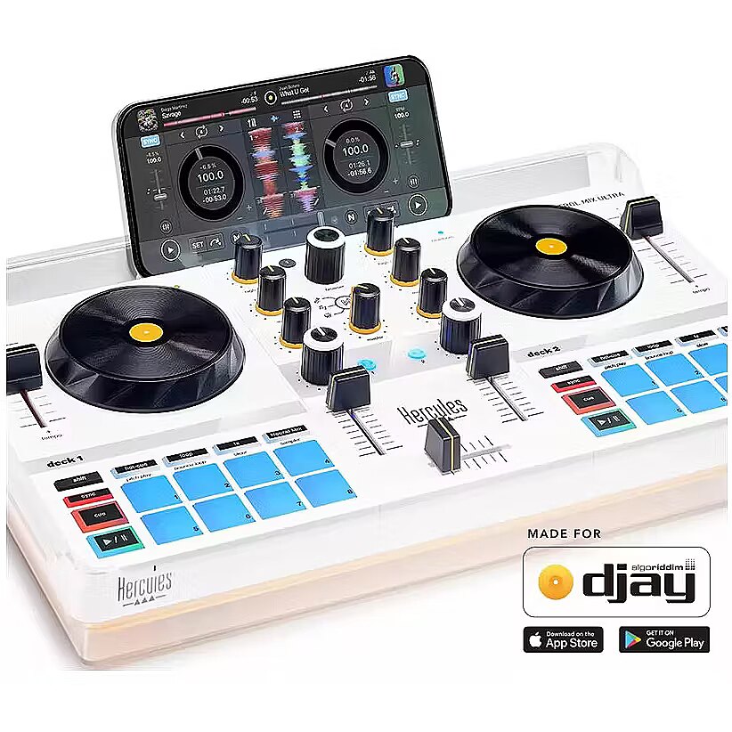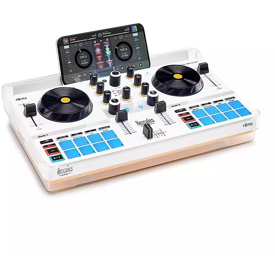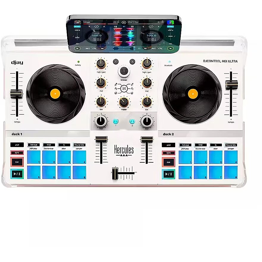 LongDesc - Unleash your DJ potential anywhere with the Hercules DJControl Mix Ultra – the ultimate mobile DJ controller designed for smartphone and tablet users.Plug and play compatible with iOS, iPadOS and Android, this compact, wireless powerhouse gives you full control over your mix, complete with tactile pitch volume faders, FX buttons, and touch-sensitive jog wheels for pro-level scratching. The built-in rechargeable battery offers up to 10 hours* of non-stop performance, allowing you to mix anywhere without cables, and its Bluetooth connectivity makes pairing effortless. Plus, mix millions of tracks by pairing the included djay app with a streaming service like Apple Music, TIDAL, Beatport Streaming, Beatsource Streaming or SoundCloud Go+.Lightweight and ultra-portable, the DJControl Mix Ultra is perfect for DJs on the move, delivering professional features in a compact size. Mix, create, and perform like never before—wherever your music takes you!*Battery life tested up to 10 hours with standard usage conditions; actual performance may vary based on usage and settings.ANYWHERE, ANYTIME. TAKE IT EASY.Created for aspiring DJs, casual hobbyists and those who want to have a fun, mobile-first DJ experience, the Hercules DJControl Mix Ultra is a mobile, feature-packed DJ controller for DJs of all levels, offering seamless compatibility with both smartphones and tablets (iOS/Android). Whether you're mixing at home, at a party, or on the go, this controller provides the freedom and flexibility to create professional-quality mixes wherever you are. Compact and lightweight, the DJControl Mix Ultra easily fits into any backpack, making it the perfect travel companion for DJs who need to perform anytime, anywhere.IT’S YOUR TURNDesigned for DJs on the moveWith the DJControl Mix Ultra, you’ll have everything you need to bring your mixes to life, no matter where inspiration strikes.Award-winning DJ softwareWhether you're a seasoned DJ or just getting started, djay provides an intuitive, user-friendly interface packed with powerful features. Available on mobile, desktop, and spatial devices, djay delivers a versatile and immersive DJ experience for all skill levels.