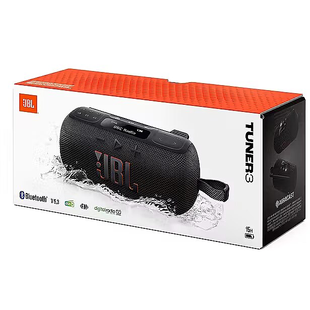 LongDesc - Crystal clear JBL Pro SoundWhether you're listening to music, talk, news, or sports, crystal clear JBL Pro Sound elevates your FM + DAB radio experience. With a more powerful driver, it's louder and delivers even punchier bass than you might expect.Up to 15 hours of playtimeDon't sweat the small stuff—like charging your battery. JBL Tuner 3 gives you up to 12 hours of playtime on a single charge and an extra 3 hours with Playtime Boost.Waterproof and dustproofThe JBL Tuner’s IP68 waterproof and dustproof rating ensures this portable speaker can handle almost any environment, from a poolside party to a seaside picnic.Tune into the fun and dive into an engaging new radio experience. Our powerful, portable JBL Tuner 3 radio keeps us locked into our favorite DAB/DAB+/FM radio stations and Bluetooth streaming, delivering bold, crystal clear JBL Pro Sound in the kitchen, by the pool, at the campsite, or wherever the mood takes us. We know it's going to elevate your listening. Get ready to crank up the volume. We've boosted the driver power, so the handy JBL Tuner 3 is loud enough to fill any space with pristine, true-to-life sound. It's our most powerful radio yet. Preset your six favorite stations so they're always at your fingertips. We also like to just explore the airwaves to see what surprises turn up on the big, clear LCD display. Either way, you get up to 15 hours of listening with Playtime Boost before you need a charge. Carry it anywhere, indoors or out, using the sturdy loop. Whether you're listening at the bathroom sink or on a white sand beach, the waterproof and dustproof design can handle just about anything. Find your own new station with the JBL Tuner 3.