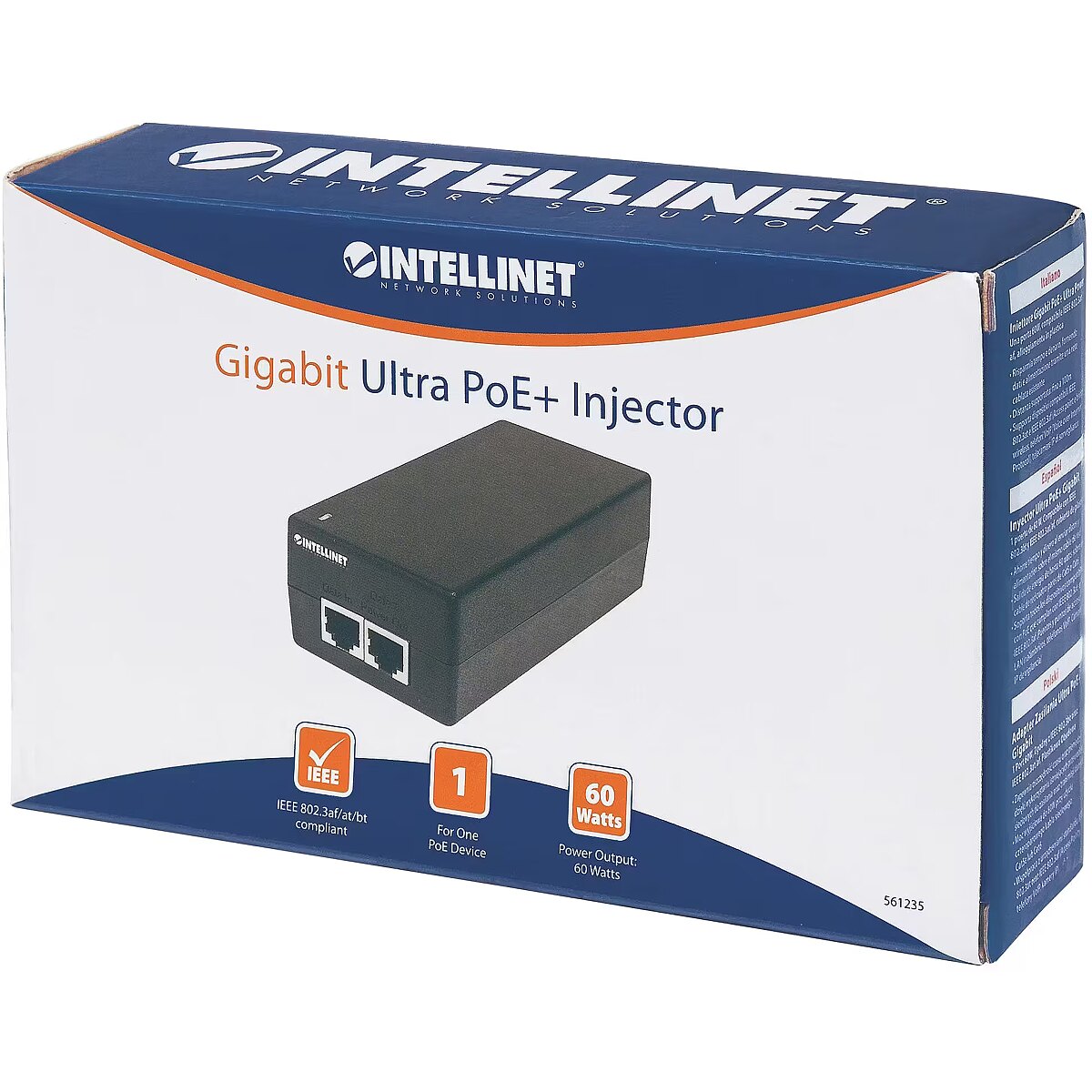 LongSummaryDescription - Intellinet Gigabit Ultra PoE+ Injector, 1 x 60 W Port, IEEE 802.3bt and IEEE 802.3at/af Compliant, Plastic Housing. Ethernet interface type: Gigabit Ethernet, Ethernet LAN data rates: 10,100,1000 Mbit/s, Networking standards: IEEE 802.3, IEEE 802.3ab, IEEE 802.3af, IEEE 802.3at, IEEE 802.3u, IEEE 802.3x. Product colour: Black. Power over Ethernet (PoE) voltage: 48 V, AC adapter input voltage: 100 - 240 V, AC adapter frequency: 50/60 Hz. Certification: FCC , CE. Width: 61 mm, Depth: 123 mm, Height: 40 mm