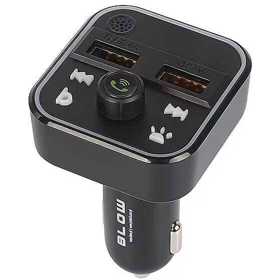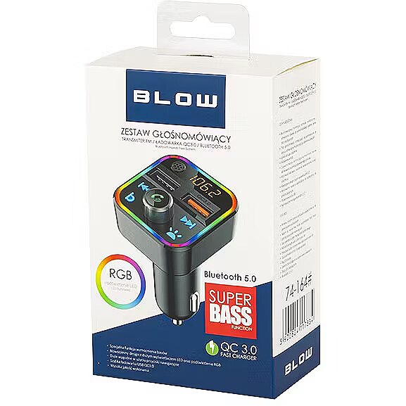 Description - Transmiter FM BLOW Bluetooth5+QC3.0 RGB Najnowsza technologia JL 5.0 Zaawansowana technologia wzmocnienia basów Dwa porty USB Nowoczesny czytelny wyświetlacz LED Podświetlenie RGB Wykrywanie napięcia akumulatora po podłączeniu do gniazda zapalniczki Możliwość aktywacji asystenta - wykorzystanie funkcji smartfonu Automatyczne przełączanie statusu z trybu odtwarzania muzyki w tryb głośnomówiący podczas odbierania połączenia OPIS PRODUKTU Transmiter FM zwiększa funkcjonalność nawet najprostszego radia w samochodzie. Dane z transmitera są przesyłane bezpośrednio do samochodowego systemu audio. Funkcja Bluetooth, wyjścia USB oraz microSD pozwalają na odtwarzanie muzyki z wielu urządzeń przenośnych. Ponadto transmiter umożliwia prowadzenie rozmów telefonicznych w trybie głośnomówiącym co zapewnia jeszcze większe bezpieczeństwo podczas prowadzenia pojazdu. Urządzenie jest zasilane bezpośrednio z gniazda zapalniczki. Zaawansowane technologie Wbudowana funkcja Bluetooth JL 5.0 to najnowsza wersja wersja popularnego standardu bezprzewodowej komunikacji. Jeszcze lepiej dostosowana do urządzeń mobilnych oraz elektronicznych akcesoriów bezprzewodowych. Zapewnia większą szybkość, stabilność oraz energooszczędność. Parowanie urządzeń odbywa się w sposób błyskawiczny, w telefonie lub innym urządzeniu wystarczy wyszukać transmiter i nawiązać z nim połączenie aby cieszyć się ze wszystkich funkcji transmitera. System wzmacniania niskich tonów Poczuj jeszcze lepszą siłę i jakość dźwięku dzięki transmiterowi BLOW. Dedykowany przyciski "B" na panelu przednim pozwala na zwiększenie natężenia basów, przez co niskie tony będą zdecydowanie głębsze. Zapewnia to jeszcze lepsze doznania muzyczne i czyni podróż wyjątkową. Dostosuj podświetlenie do wnętrza auta Kolorowe diody LED umożliwiają na wybranie barwy podświetlenia transmitera, dzięki czemu możemy nadać większy charaktert wnętrza naszego auta a dodatkowo w ciemności bez problemy odnajdziemy port ładowania bez konieczności używania dodateowego źródła światła. Do wyboru mamy takie kolory jak czerwony, zielony oraz niebieski. A dodatkowa funkcja "dancing" zmienia kolory w rytm muzyki z całej palety barw RGB. Zwiększ swoje bezpieczeństwo podczas jazdy Transmiter jest wyposażony w funkcję zestawu głośnomówiącego. Ta nadzwyczaj przydatna funkcja automatycznie przełączy się z trybu odtawrzania muzyki w tryb głośnomówiący po odebraniu przez nas połączenia. Połączenie możemy odebreć na panelu transmitera bez konieczności szukania telefonu. Dzięki czemu nasza podróż stanie się dużo bezpieczniejsza i wygodniejsza.