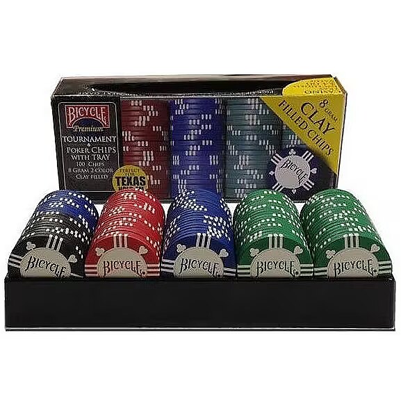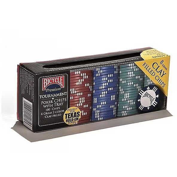 Description - An eye-catching set of 100 poker chips made by the world leaders in card production - USPCC - owner of the Bicycle brand. A set of poker chips by the American brand Bicycle. Weight of a single chip - 8g. The chips are arranged on a black plastic tray. All packed in an attractive cardboard box. Ideal for home games as well as professional tournaments. The chips are available in four colours symbolising different values, but these are not printed on. Instead, the characteristic Bicycle card logo and card symbols such as hearts, diamonds, clubs and spades appear. This treatment makes the chips more versatile when it comes to out-of-the-box use. That is, in tricks, illusions and as a complement to Bicycle cards.
