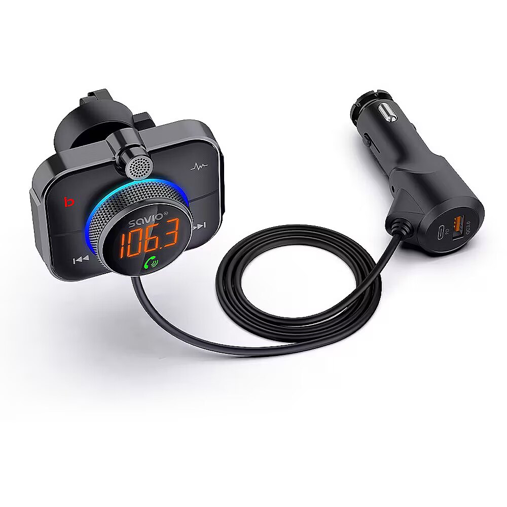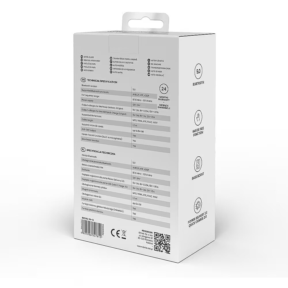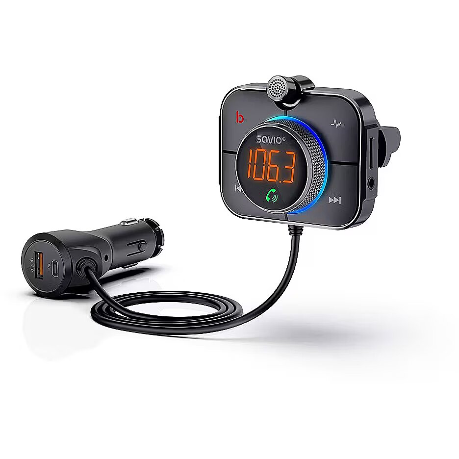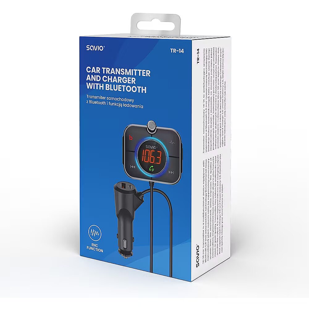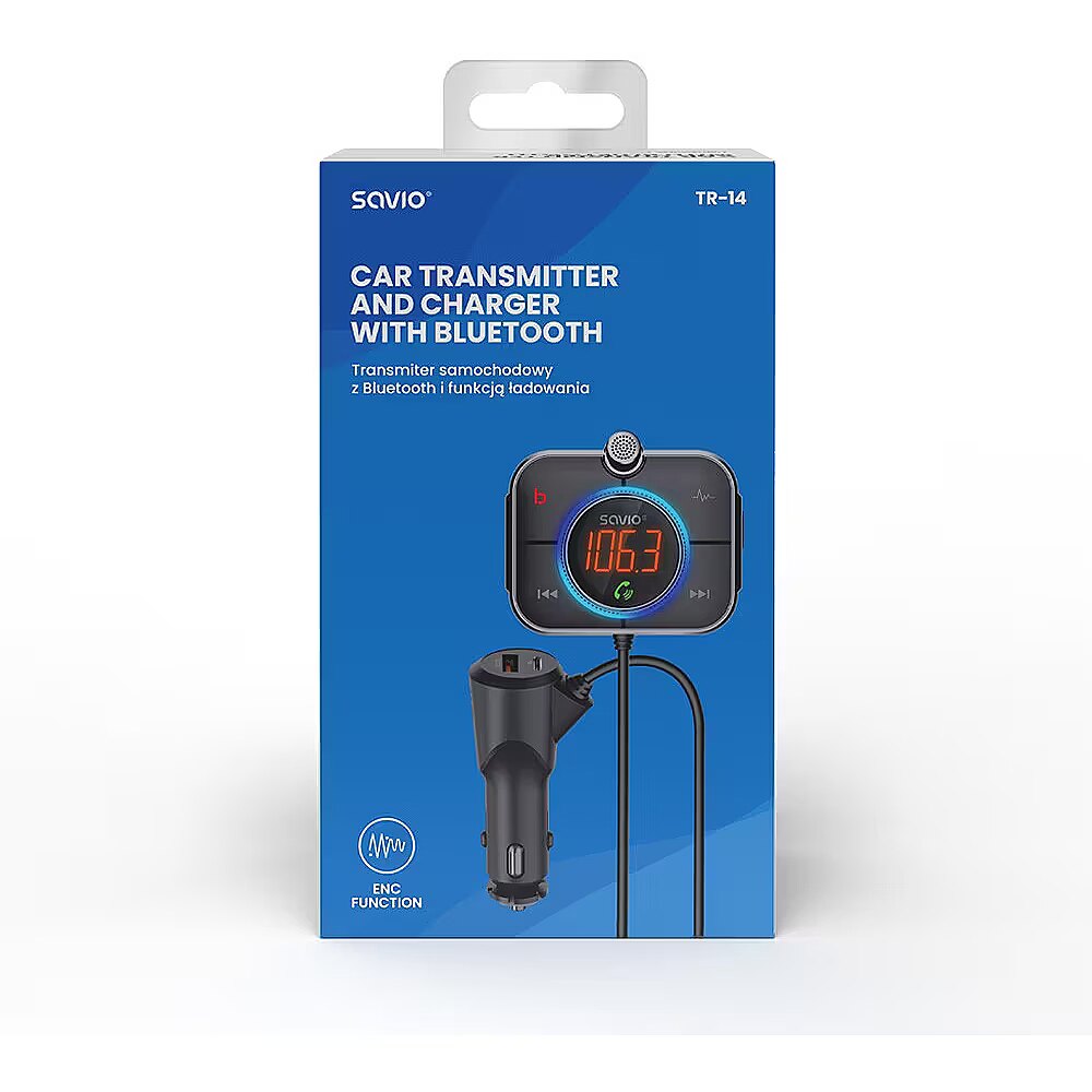Description - The TR-14 car transmitter is a multifunctional device equipped with Bluetooth 5.0 and advanced ENC (Environmental Noise Cancellation) technology. It reduces noise by suppressing unnecessary background noises, significantly improving the quality of conversations. The music processor allows you to play your favourite songs in excellent quality. The transmitter has a Micro SD multimedia input and AUX line output. It is also equipped with two fast charging outputs supporting Quick Charge 3.0 and Power Delivery 3.0, so you can charge your smartphone or tablet in no time. The illuminated ring, together with a choice of colours, will make the device blend in perfectly with any car interior. Bluetooth 5.0 The TR-14 car transmitter is equipped with Bluetooth 5.0. This module ensures stable connectivity, also offering twice the transfer rate and improved range compared to older Bluetooth versions. Hands-free function The Savio TR-14 allows you to control incoming calls without losing focus on the road. This will significantly increase your comfort and safety when driving. Bass boost Bass boost is a built-in effect that amplifies low frequencies. It is comparable to an equaliser, but is limited to a single-band boost in the low frequency range. This function is great for listening to dynamic music. Power Delivery 3.0 / Quick Charge 3.0 Power Delivery 3.0 and Quick Charge 3.0 are technologies that allow you to charge your devices up to four times faster than conventional charging. So you'll spend less time charging and be ready to hit the road faster! ENC function ENC (environmental noise cancellation) is a function that serves to dampen ambient noise during phone calls. The combination of this function together with the rotating microphone will ensure that your caller on the handset hears your clear voice, whether you are having a conversation while driving or in a crowded car park. AUX OUT / Micro SD slot The TR-14 car transmitter not only has wireless functions, as it is equipped with an AUX-OUT port, thanks to which you can connect the transmitter to the AUX-IN socket in your car and enjoy lossless sound quality. The device also has a slot for a Micro SD card.