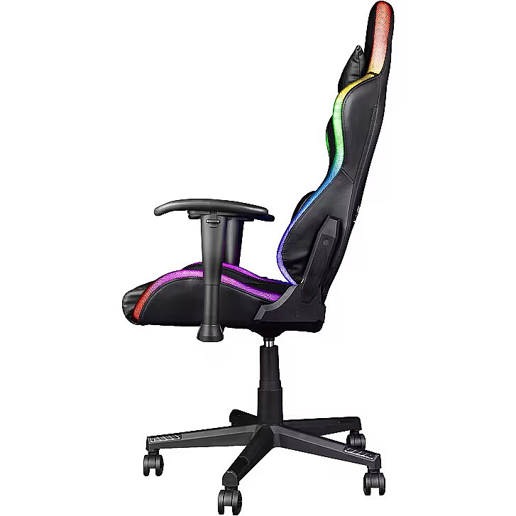 Description - GXT 716 Rizza RGB LED Illuminated Gaming Chair Key features - Fully integrated RGB LED-illuminated edges - Personalise your light experience with a combined total of 350 colours and effects - Wireless remote control to change colour and effect setting and adjust brightness - Additional pockets to store remote control and powerbank - Height adjustable and in/outwards rotatable armrests - 175° tiltable backrest with locking possibilities - Comfortable back support made of moulded foam - Solid base frame with 60mm wheels - Full 360° rotatable seating - Adjustable neck and lumbar pillow - High-quality class 4 gas lift