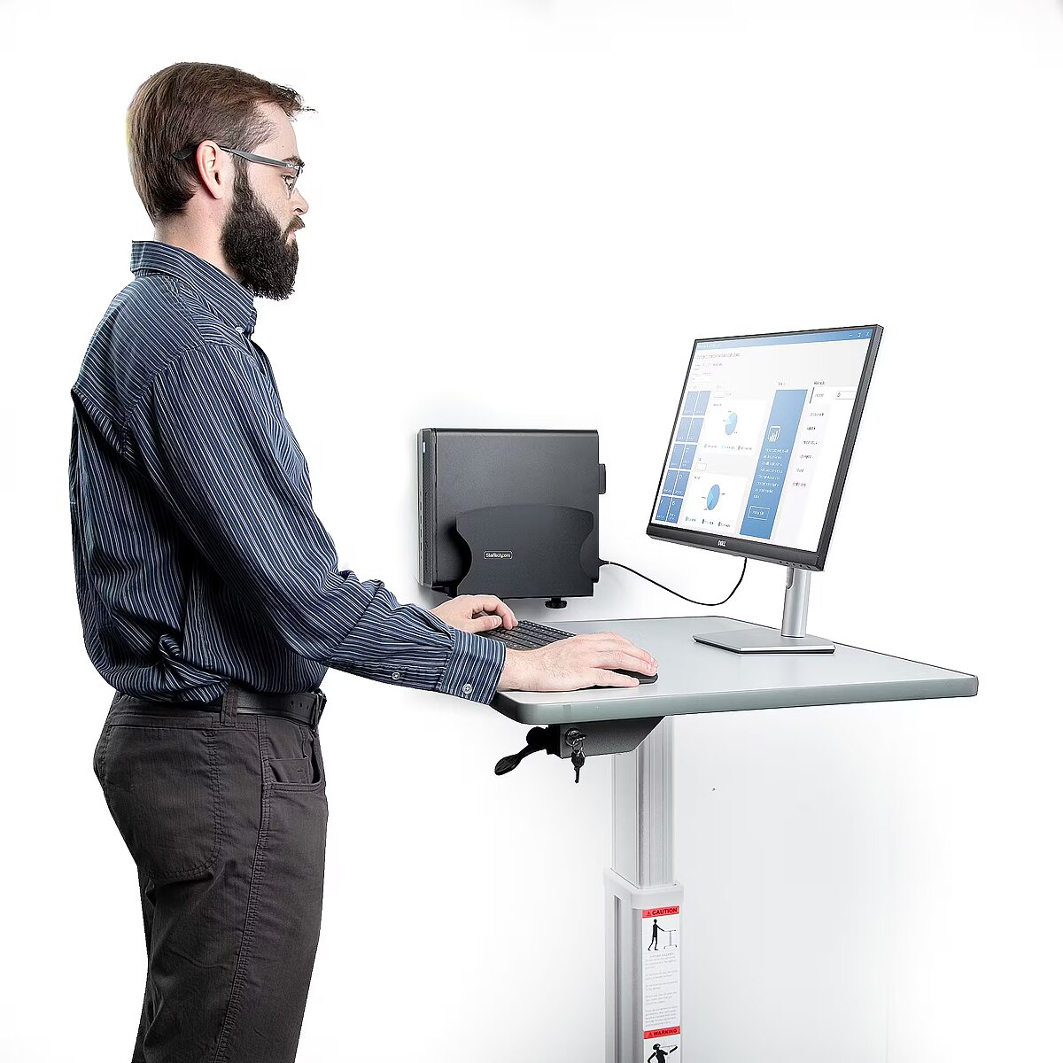 LongDesc - Heavy-duty desktop computer wall mount bracket featuring adjustable widths, toolless adjustment, and intuitive keyhole mountingProfessional PC Wall Mount Bracket is designed to meet the needs of IT professionals seeking a space-saving and convenient solution for their workstation setups. The supported desktop towers widths are between 1.9 to 7.8 inches (50 to 200 mm). This heavy-duty wall mount system is constructed of a 0.09in (2.5mm) thick powder-coated SPCC steel sheets, ensuring durability and strength. With a weight capacity of up to 39.6lbs (18kg), it provides a secure mount for desktop computers. Experience effortless installation with the keyhole mounting to speed up deployment.Space-Saving Open DesignOptimize your workspace by freeing up valuable desk or floor space. The computer wall mount system enables convenient concrete/wood stud wall mounting of a computer chassis. Alternatively, you can mount the computer to the side of a desk, enabling additional installation location options.Enjoy unobstructed access to drive bays, peripheral ports, and wiring with the open design of the PC holder.Toolless AdjustmentQuickly adjust the width of the PC wall mount bracket using the knobs. Included spacers protect the chassis and ensure a snug fit. The spacers allow different CPU sizes ranging from 1.9 to 7.8 inches (50 to 200 mm) up to Small Form Factor (SFF) computers.The StarTech.com Advantage
