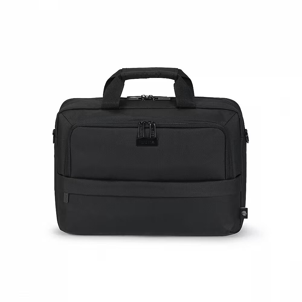 Description - Eco Top Traveller CORE 13-14.1" Laptop Bag Today's actions shape the world of tomorrow. That's why at DICOTA we are dedicated to developing environmentally friendly solutions and that's why we manufacture all products from our ECO collections from eco-friendly, recycled PET. We reuse up to 36 PET bottles, so you get an environmentally friendly product with a lifetime guarantee. Our PET products also have the quality, look and finish you know and love. Made from 6.5 recycled PET bottles Padded notebook compartment with high-density foam (HDF) Front compartment with pockets for mobile accessories Zipper pocket for power supply and cable Hidden compartment for GPS tracker Zipper pocket with RFID blocking Document pocket on the back Padded shoulder strap Waterproof material Padded notebook compartment with high-density foam (HDF) for optimal protection notebooks. The front pocket is specially designed for mobile accessories, while a zipped pocket offers space for a power supply and cable. A hidden compartment for a GPS tracker means you can always keep an eye on your bag, while a zipped pocket with RFID blocking protects personal data from unauthorized access. Important documents can be safely stored in the rear document pocket, while a padded shoulder strap ensures comfortable carrying. The bag is complemented by water-resistant material that reliably protects the contents from the elements.