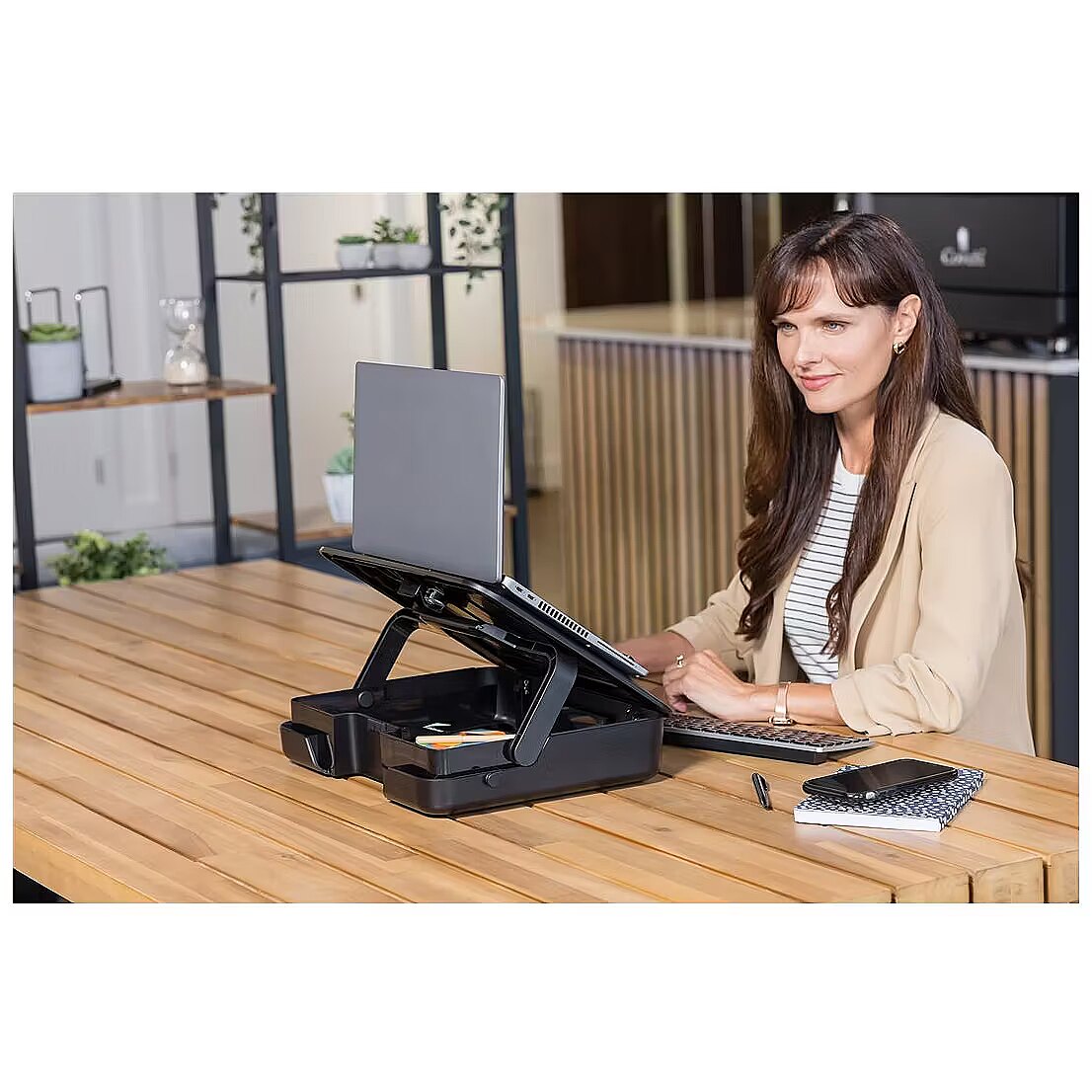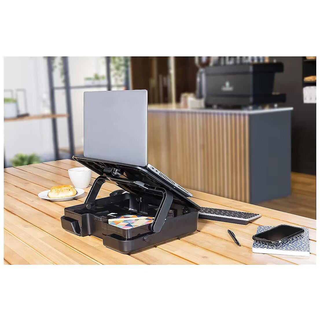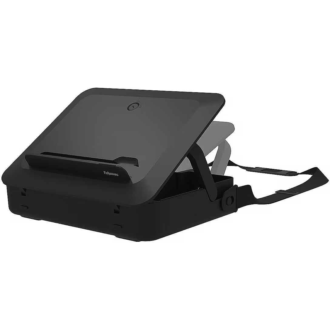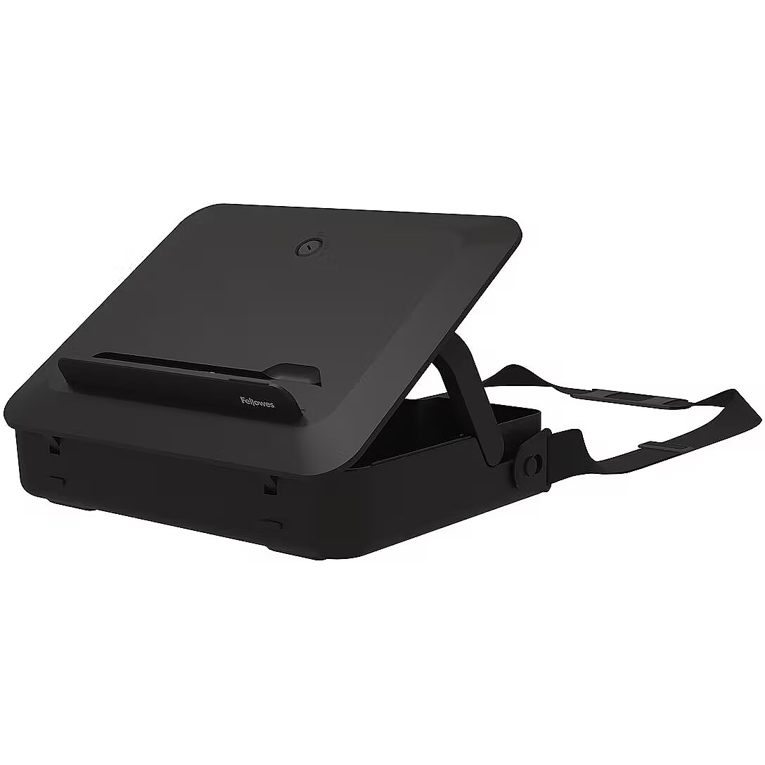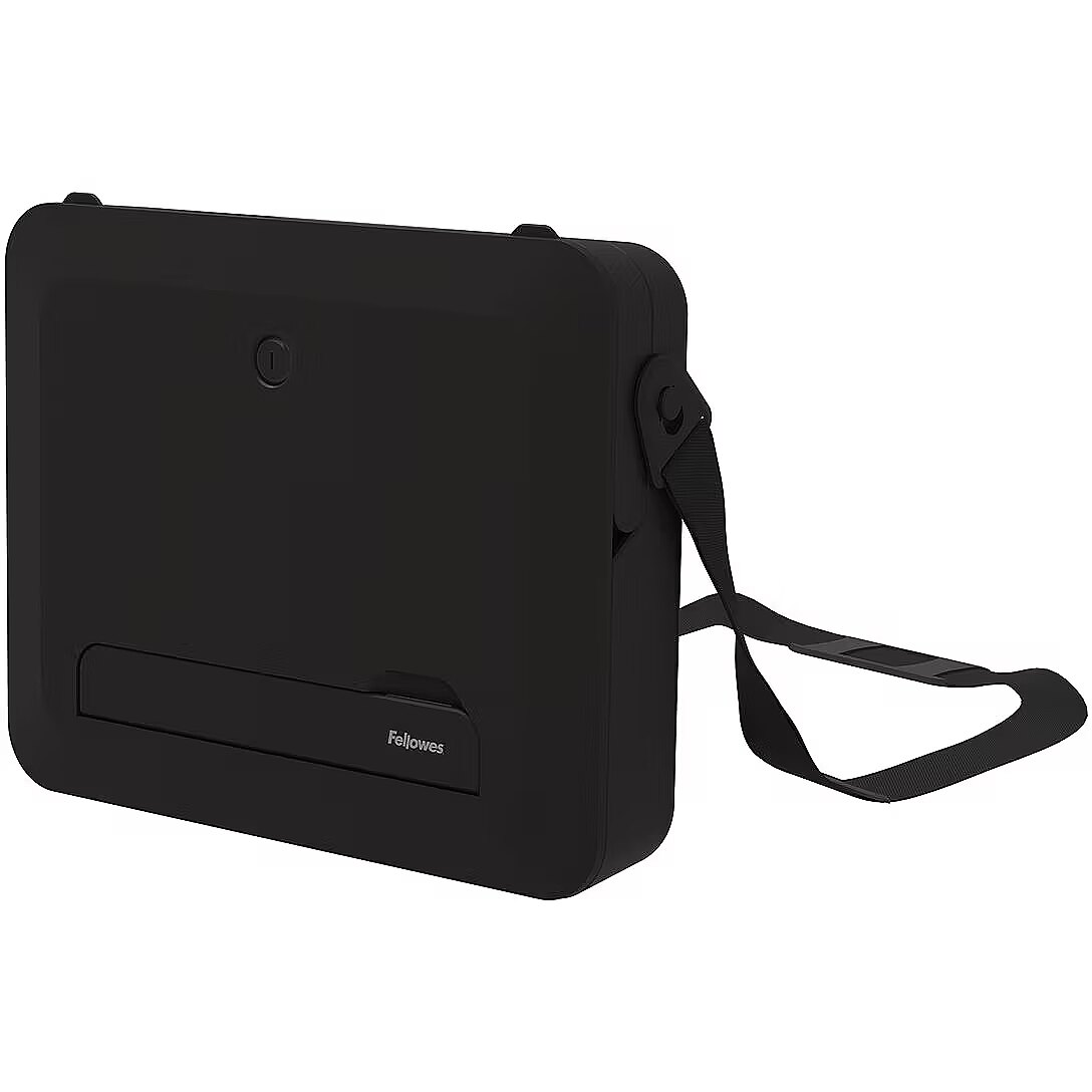 LongDesc - Elevate your work setup with Fellowes Breyta laptop stand carry case. Seamlessly combining a storage/carry case and a laptop riser, this innovative 2-in-1 design adapts to your on-the-go work needs. Experience ergonomic perfection with five adjustable height settings, tailoring your laptop's position for optimal viewing comfort and reducing strain during your workday. Its portable design simplifies setup, adjustment, and storage, catering to the ever-evolving demands of hybrid working. The built-in handle and optional carry strap ensure effortless transportation. Choose between black or white to match your workspace's modern design aesthetics. Enhance your workspace with the Breyta laptop stand carry case – where comfort, style, and sustainability come together seamlessly to elevate your productivity and well-being. This sustainable product is to last with a 5-year extended warranty, and access to the best customer service to help with any queries.