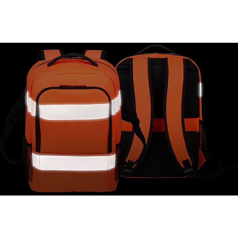 Description - Hi-Vis Base Backpack 24 Litres in Orange. Maximum visibility outdoors and work safety. The Hi-Vis Base Backpack guarantees excellent visibility at night or in the rain, while providing plenty of space for everyday essentials. The fluorescent colour and ISO-certified reflective stripes ensure optimum visibility when cycling, commuting or working in traffic! Designed with maximum simplicity, safety and functionality in mind, this backpack is a reliable solution for outdoor situations where increased visibility is required. The backpack has reflective stripes and the main material is in fluorescent colours and is made from recycled PET bottles to protect both the owner and the environment. The Hi-Vis fabric and 3M reflective stripes are certified according to the European standard EN ISO 20471:2013 and provide excellent visibility, improving safety when working near road traffic, railway tracks or construction sites. The 24-litre capacity will effectively accommodate both work and personal items. The main compartment offers plenty of space for a lunch box, clothes or documents, while a high-density foam section keeps your laptop or tablet safe. The front compartment holds your smartphone, power supply, keys and other accessories. Valuables can be safely stored in the rear compartment to prevent theft. A discreet Velcro area allows you to personalise the backpack with a logo or name patch. Offering maximum space, comfort and visibility, the 24-litre Hi-Vis Base Backpack is ideal for a busy day in the great outdoors and helps prevent accidents. Lightweight backpack with proven safety benefits of Hi-Vis materials High visibility fluorescent fabric and 3M reflective stripes are EN ISO 20471:2013 certified Large main compartment for lunch box, documents, clothes and more Internal laptop compartment padded with high-density foam Front compartment with internal pockets for mobile phone, keys, pens and other essentials Two elastic side pockets for umbrella and water bottle Separate valuables compartment on the back Velcro panel for your own logo and/or name patch (approx. 230 x 45 mm) Efficient for everyday use with a capacity of 24 litres Soft back and lumbar padding and adjustable shoulder straps for maximum comfort Made from durable 600D rPET fabric with water-repellent properties Recycles 12 PET bottles per backpack
