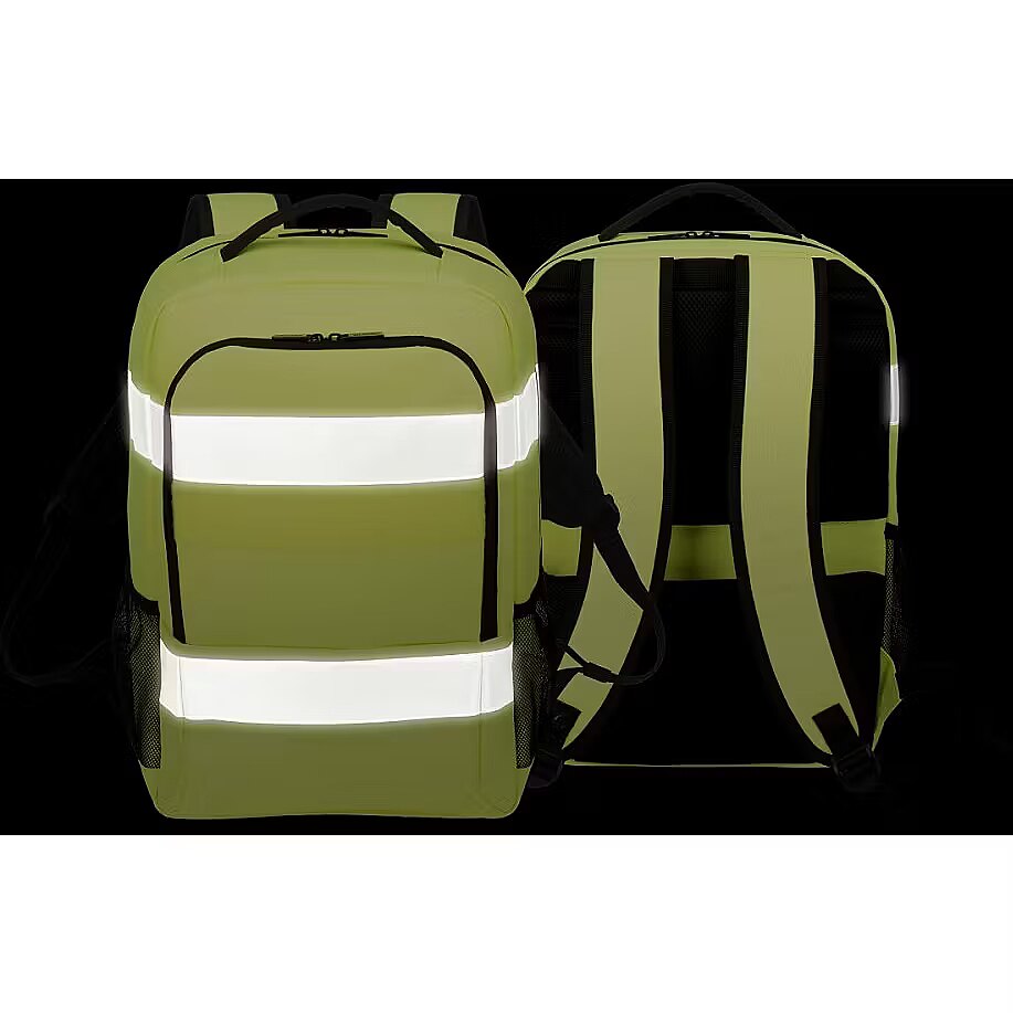 Description - Hi-Vis Base Backpack 24 Litres Yellow. Maximum visibility outdoors and work safety. The Hi-Vis Base Backpack guarantees excellent visibility at night or in the rain, while providing plenty of space for everyday essentials. The fluorescent colour and ISO-certified reflective stripes ensure optimum visibility when cycling, commuting or working in traffic! Designed with maximum simplicity, safety and functionality in mind, this backpack is a reliable solution for outdoor situations where increased visibility is required. The backpack has reflective stripes and the main material is in fluorescent colours and is made from recycled PET bottles to protect both the owner and the environment. The Hi-Vis fabric and 3M reflective stripes are certified according to the European standard EN ISO 20471:2013 and provide excellent visibility, improving safety when working near traffic, railway tracks or construction sites. The 24-litre capacity will effectively hold both work and personal items. The main compartment offers plenty of space for a lunch box, clothes or documents, while a high-density foam section keeps your laptop or tablet safe. The front compartment holds your smartphone, power supply, keys and other accessories. Valuables can be safely stored in the rear compartment to prevent theft. A discreet Velcro area allows you to personalise the backpack with a logo or name patch. Offering maximum space, comfort and visibility, the 24-litre Hi-Vis Base Backpack is ideal for a busy day in the great outdoors and helps prevent accidents. Lightweight backpack with proven safety benefits of Hi-Vis materials High visibility fluorescent fabric and 3M reflective stripes are EN ISO 20471:2013 certified Large main compartment for lunch box, documents, clothes and more Internal laptop compartment padded with high-density foam Front compartment with internal pockets for mobile phone, keys, pens and other essentials Two elastic side pockets for umbrella and water bottle Separate valuables compartment on the back Velcro panel for your own logo and/or name patch (approx. 230 x 45 mm) Efficient for everyday use with a capacity of 24 litres Soft back and lumbar padding and adjustable shoulder straps for maximum comfort Made from durable 600D rPET fabric with water-repellent properties Recycles 12 PET bottles per backpack