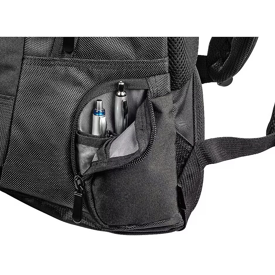 Description - A comfortable laptop backpack with a classic look. The VIENNA backpack can carry a laptop as well as handy documents and small accessories. Great organisation With a separate, softly padded compartment for up to a 15.6" laptop, you can transport your delicate equipment safely and comfortably. It has an additional compartment for documents and a double zipper closure provides easy access to all contents. The backpack has a spacious front pocket with an organizer structure for additional accessories and small side pockets, e.g. for keys or a pen. Comfortable Thanks to its optimal size and low weight, the backpack is very handy. The comfortable carrying handle, adjustable shoulder straps and padded back ensure that you can carry it comfortably even for long hours. Music fans will be pleased to know that the backpack also has a headphone output. Elegant design The black exterior and subtle accessories give the backpack an elegant look.  Thoughtful design makes the backpack a classic addition to any outfit. High quality The backpack is a high quality product, which is a perfect combination of classic design and functionality. Good quality materials ensure durability and effectively protect your laptop from damage. Features: Classic laptop backpack Padded interior provides reliable protection during transport Internal organizer for easy storage of small accessories Notebook dimensions: up to 15.6" Internal dimensions: 28 x 4 x 38.5 cm External dimensions: 35 x 15 x 43 cm Colour: black Material: Polyester Weight: 800g Benefits for you: Comfortable backpack to transport your laptop safely Classic look