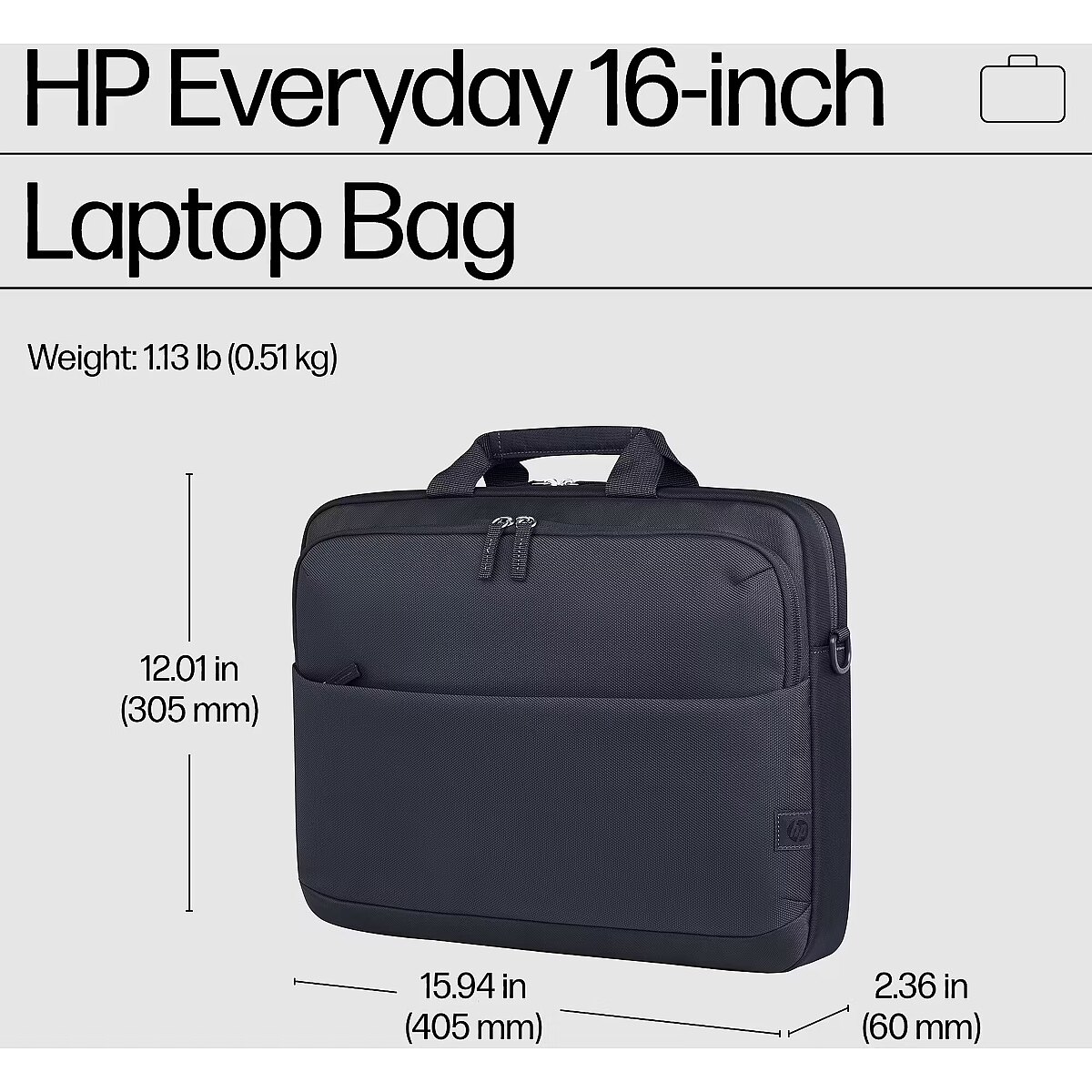 LongSummaryDescription - HP Everyday 16-inch Laptop Bag. Case type: Messenger case, Maximum screen size: 40.6 cm (16"), Shoulder strap. Weight: 510 g. Surface coloration: Monochromatic