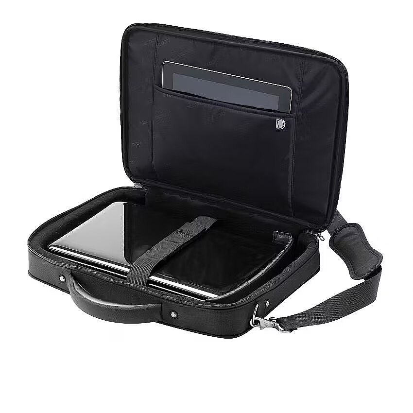 Description - Notebook bag Eco Multi Compact 14-15.6 inches, black The Eco Multi COMPACT is the perfect companion for the safe transport of your notebook, tablet and further mobile computing equipment. The bag reliably accompanies you everywhere and meets the highest standards of quality, functionality and protection The lockable notebook compartment with a notebook fastening strap has extremely lightweight cushioning made of High-Density Foam (HDF) that surrounds your notebook 14-15.6" providing maximum safety. The padded slip pocket provides reliable protection for tablets up to 12.9". Smartphone, pens, business cards and documents are always at hand in their designated holders in the front pocket. The workstation in the case interior, which features an additional zip pocket, as well as the open document compartment on the rear side offer storage room for mobile accessories. The soft, specially designed carry handle makes for comfortable transportation. The cushioned shoulder strap as well as the trolley belt keep your hands free and make transport a pleasure. The Eco Multi COMPACT is perfect for you if you are always on the go and want to support the recycling of PET bottles with an eco-friendly bag.