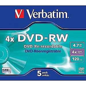 LongSummaryDescription - Verbatim VB-DMW44JC. Native capacity: 4.7 GB, Type: DVD-RW, Quantity per pack: 1 pc(s). Package type: Jewel case. DVD write speed: 4x