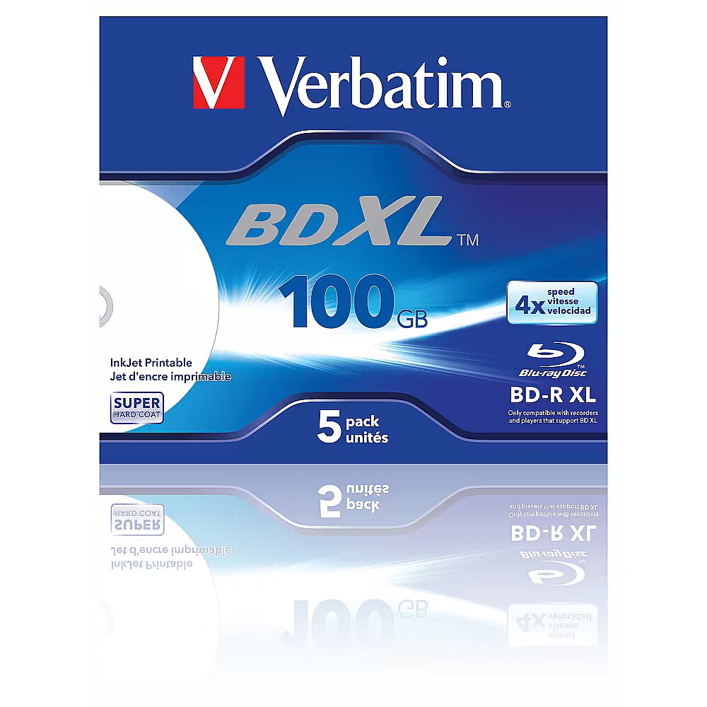LongSummaryDescription - Verbatim BD-R XL 100GB* 4x Wide Inkjet Printable 5 Pack Jewel Case. Type: BD-R, Native capacity: 100 GB, Optical disc diameter: 120 mm. BD-R write speed: 4x. Quantity per pack: 5 pc(s), Package type: Jewelcase