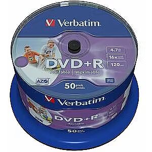 LongSummaryDescription - Verbatim DVD+R Wide Inkjet Printable No ID Brand. Native capacity: 4.7 GB, Type: DVD+R, Quantity per pack: 50 pc(s). Package type: Spindle. DVD write speed: 16x