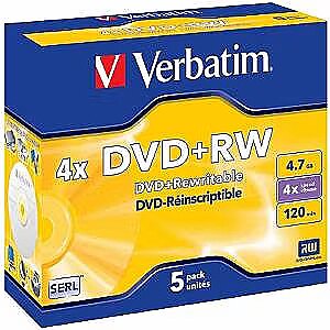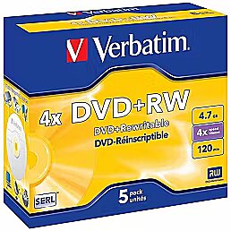 LongDesc - - Verbatim DVDR/RW uses MKM/Verbatim's technology which ensures any recording to be of a superior quality. Mitsubishi Chemical's R&D combined with its strong coorperation with drive manufacturers ensures the broad compatibility of Verbatim's discs making them ideal for sharing computer data, home videos, photos and music. From Europe's Number 1 for recordable media- DVD+RW is a rewritable disc providing 4.7GB capacity. Compliant with the +RW-Alliance specifications. Verbatim's DVD+Rewritable use a Super Eutectic Recording layer (SERL). SERL ensures that noise-free recording can be enjoyed time and time again. With conventional rewritable media, the recording layer deteriorates with every rewrite, meaning a decrease in quality. With Verbatim rewritable media however, the recording layer is returned to perfect condition on every erase cycle, leaving a flawless disc for the next recording.- DVD+RW is a sequential read / write media primarily designed for video recording and streaming backup applications. DVD+RW discs can be written up to 1000 times. A number of DVD-ROM drives and DVD video players support DVD+RW.- Increased resistance to UV light.- Proprietary SERL Technology.- Superior Archival Life.- This is a disc with a matt silver surface. It can be written on with a CD/DVD marker pen.