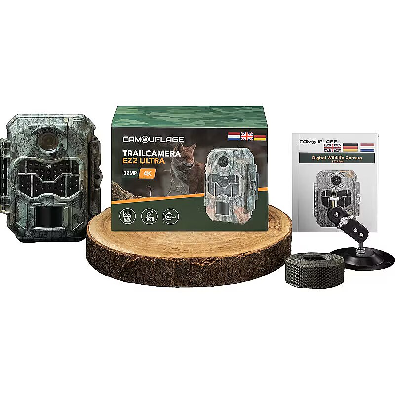 description_en - 4K video recording Photos up to 32 megapixels Response time: 0.6 s Night mode with 45 infrared LEDs 90° viewing angle 20-meter working distance Built-in microphone Storage on a microSD memory card (up to 512 GB) Power supply: 8 × AA battery IP66 weatherproof design Camouflage EZ2 Ultra Wildcamera is a wildlife camera perfect for around the house or in the woods. It comes equipped with a 32 MP camera that produces crisp images and can record videos in 4K quality. Camouflage EZ2 Ultra trail camera offer a discrete and efficient way to observe wildlife and monitor activities in your outdoor space. This compact and weather-resistant camera is equipped with motion sensors, capturing high-resolution images or videos whenever there is movement. Ideal for nature enthusiasts, gardeners, or those curious about the nocturnal visitors to their yards, Camouflage EZ2 Ultra trail camera provide a glimpse into the secret lives of creatures that frequent your garden. The Camouflage EZ2 Ultra is fully waterproof according to the IP-66 rating, making it resistant to heavy rain. With the included mounting strap, you can easily hang the camera from a tree. You can easily review the captured images on your laptop or PC and enjoy all the beauty that nature has to offer. What´s in the box Camera Mounting straps and wall mount USB-cable