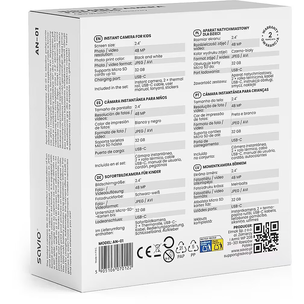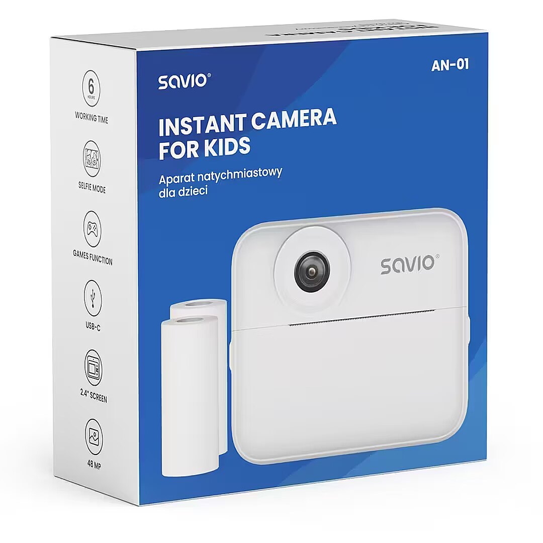 Description - Instant camera for kids AN-01 The Savio AN-01 instant camera is the perfect combination of fun and creativity. It allows children not only to take photos and record videos but also to instantly print pictures on thermal paper, without the need for ink. With its simple interface, colorful screen, and built-in games, kids can develop their imagination and enjoy capturing memories anywhere at home, on vacation, or during family gatherings. 6 hours of battery life uninterrupted fun The built-in 1200 mAh battery provides up to 6 hours of continuous use.