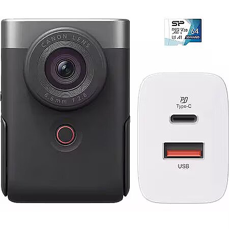 Accessories included - Korpus kamery PowerShot V10 Karta pamięci PRO V30 64 GB z adapterem 20-watowa sieciowa ładowarka USB QM16 z adapterem (do użytku w różnych krajach) Kabel interfejsu IFC-100U 2.0 (kabel USB typu C C) Pasek na nadgarstek Zestaw instrukcji obsługi