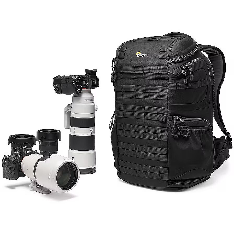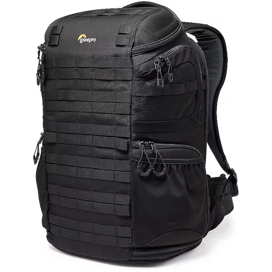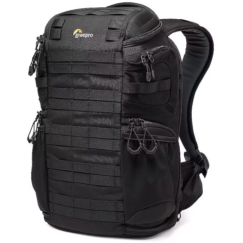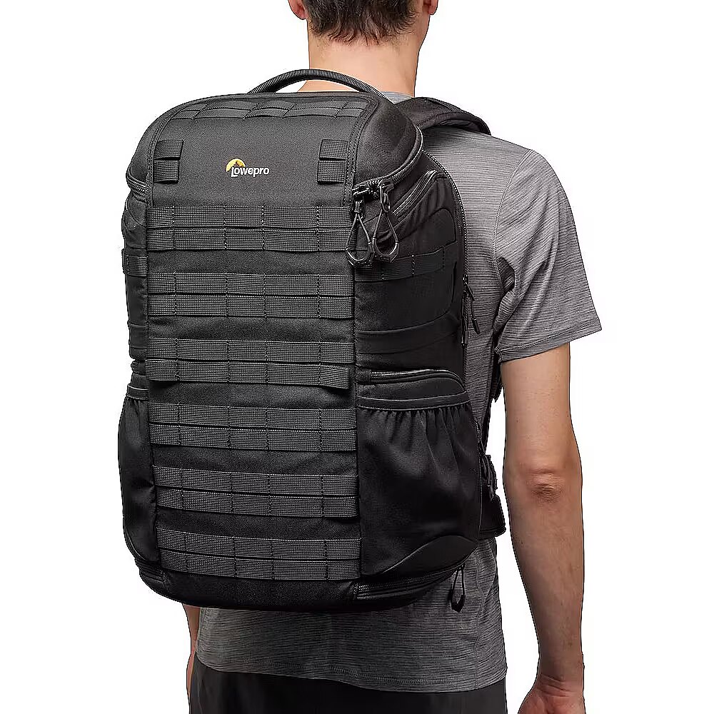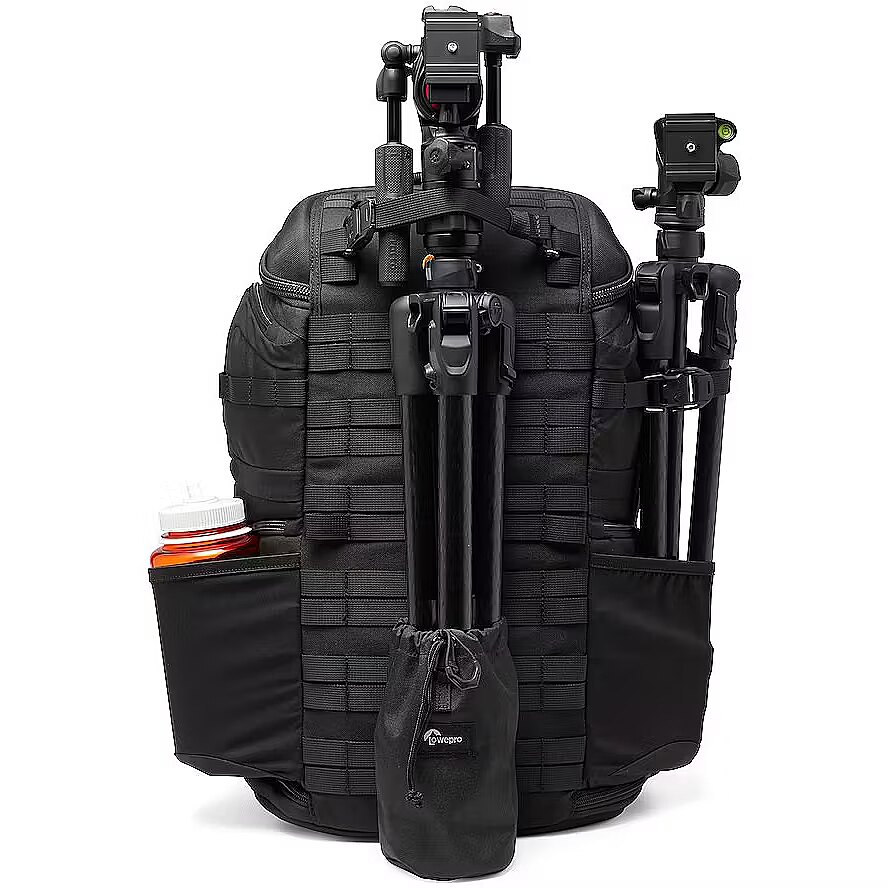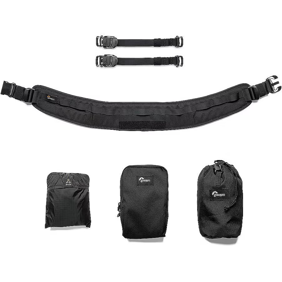Внешняя часть оснащена гибридной системой крепления ремней, совместимой с более широкими язычками SlipLock™ от Lowepro и стандартными подсумками MOLLE или PALS. В комплект входят следующие аксессуары, которые можно прикрепить к системе SlipLock: сумка на молнии, сумка на шнурке для бутылки емкостью 1 литр или ножки штатива, два быстросъемных ремня и дождевик All Weather Cover™. Комфорт