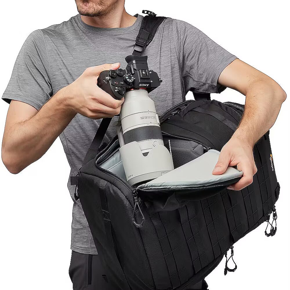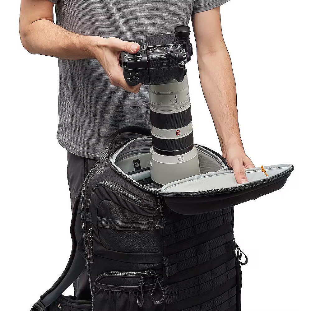 Внутри задней дверцы сумки вы найдете прозрачные карманы на молнии для ноутбука CradleFit, в который можно положить MacBook Pro с диагональю до 16 дюймов. Боковые двери имеют большие растягивающиеся внешние карманы, вмещающие бутылку объемом до 1 литра, и укреплены внизу для установки штатива. Дополнительные петли и карманы в верхней части по бокам обеспечивают быстрый доступ к предметам и надежное крепление штатива. Рюкзак стоит самостоятельно, что упрощает обращение с ним и доступ к вашему снаряжению. Модульная система крепления SlipLock и аксессуары.