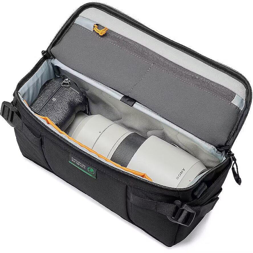 description_en - Rugged compact convertible camera sling/shoulder bag for fullframe mirrorless camera with 70-200mm F2.8 lens. Molded MaxFit™ dividers tuned for protection and weight Works with ProTactic III waistbelts for waistpack carry Fits inside ProTactic Lite BP side door when you need a backpack Includes 2 accessory straps and All Weather Cover™ 85% recycled fabric* - lab & field tested for durability Adapt to Every Moment
