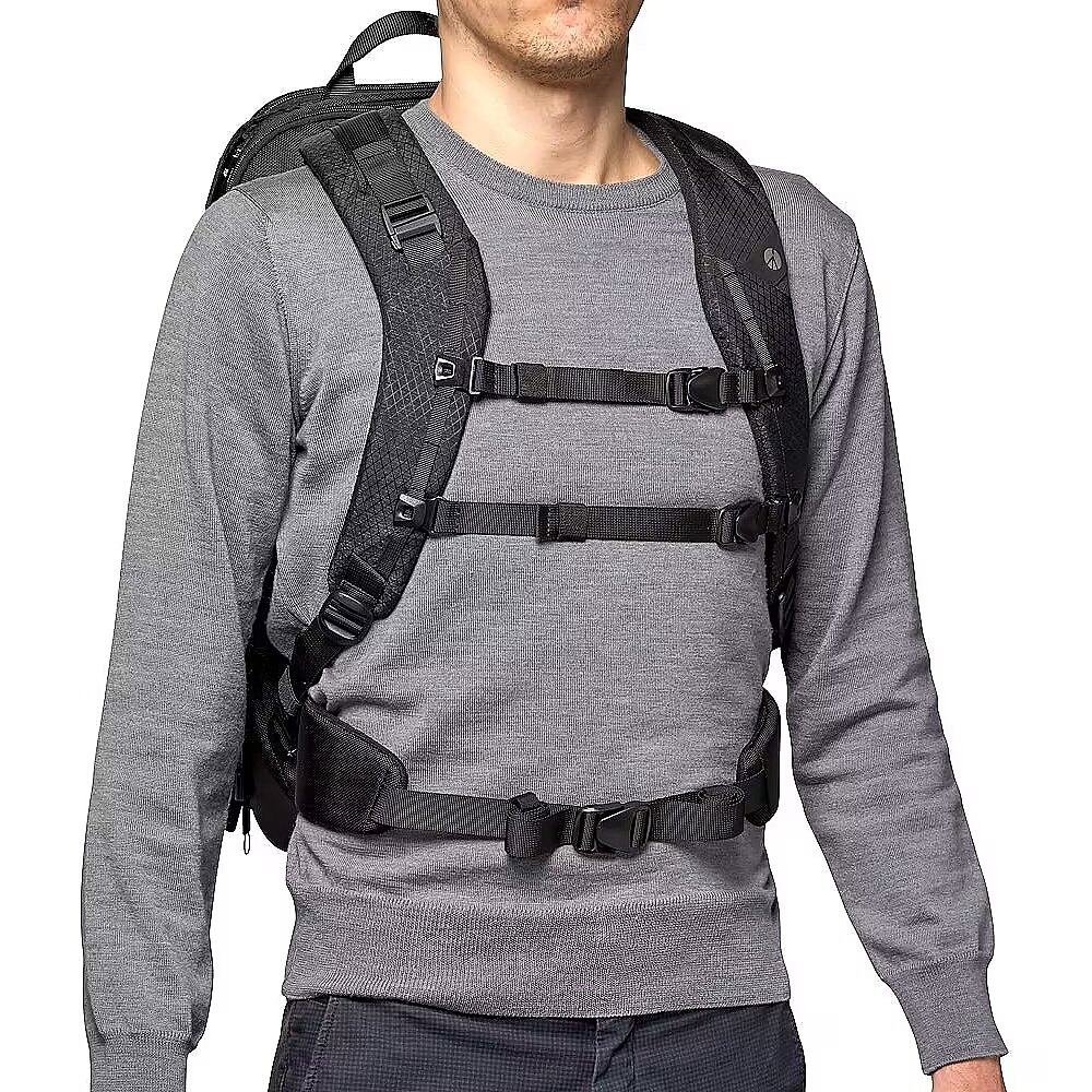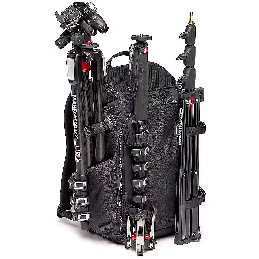 It also offers a side attachment that can carry a full-sized tripod (up to the 055 series) and a front attachment that can be split into 2 to carry monopods or small light stands. It also features a checkpoint friendly 15” laptop compartment, adjustable torso height, double chest straps and a padded waist belt for load distribution. This backpack is built to keep professional gear protected while providing optimal comfort even in long periods of carrying. The harness system not only distributes weight evenly from the shoulders to the waist and hips but also maximizes breathability through a contoured EVA mesh panel. The backpack is made of water-repellant Ripstop nylon/polyester fabric with reinforcement yarns to achieve a balance of light weight, unique look, and high capacity performance. Duraflex hardware, YKK zippers, hypalon reinforcement, trims and pullers make the pack both ultra-lightweight and strong enough to withstand the most intense use to ensure long-term protection for large amounts of gear. It also comes with a DuoFace sun/rain cover, which provides extra protection in rough weather and reflects sunlight, keep gear cool and dry all day long. 4 access points to reach into exactly what gear you need New M-Guard™ provides the highest level of gear protection 3 ergonomic modes of use: Backpack, sling, or video duffle bag Tuck-away strap system secures multiple pro tripods/support gear Adjustable harness system and double adjustable chest strap