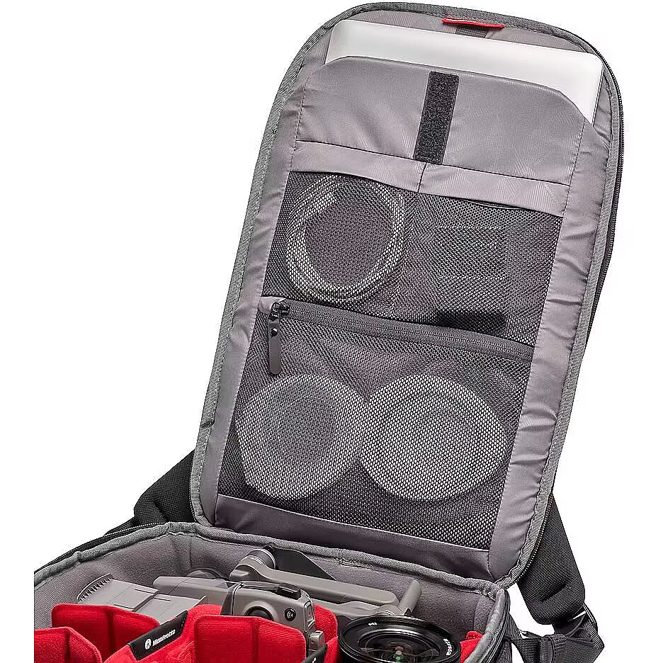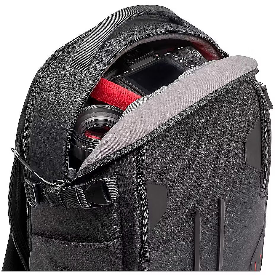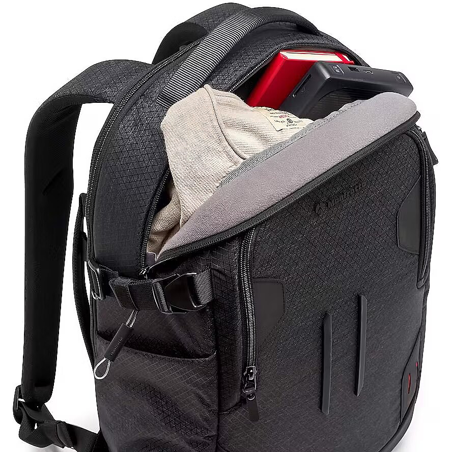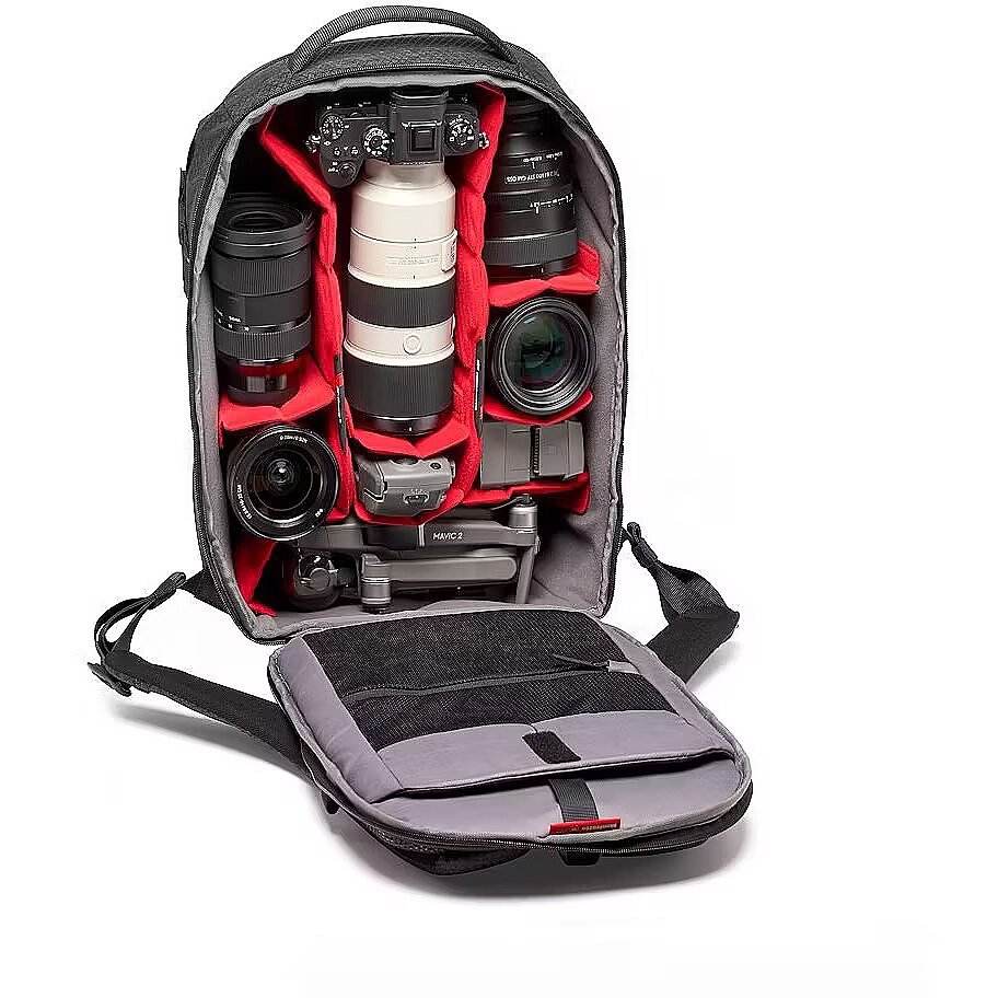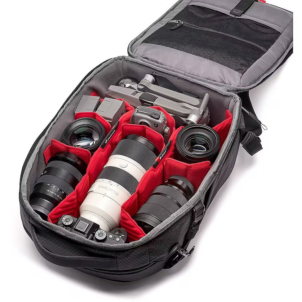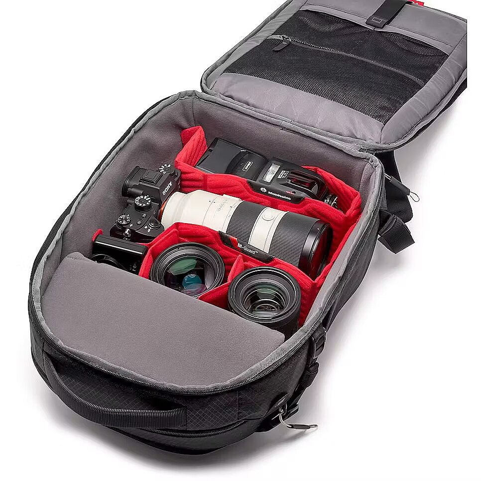 description_en - The Manfrotto PRO Light Backloader Camera backpack is a professional camera bag specifically designed to provide unparalleled gear protection and modularity to fit the preference and workflow of any professional photographer or filmmaker. The Pro Light backpacks usher in the all-new M-Guard Protection System specifically designed and laboratory tested to guarantee the highest level of protection and shock resistance especially on areas of the bag where protection is most crucial. M-Guard dividers are made of high-density EVA foam that provides exceptional shock absorption while maintaining a super slim profile. In addition, the SAS-TEC, a viscoelastic memory foam and multi-impact endurance, adds a structural reinforcement on the base of the backpack providing extra shock absorbing properties. The PRO Light Backloader comes with a safe rear access into the camera gear compartment. The Backloader S holds 2-3 full frame mirrorless cameras (no vertical grip attached) on the main compartment plus multiple lenses. Alternatively the internal organization arrangement can be customized to meet different storage needs with the moveable interior panel that split the internal space: the top compartment can be dedicated 30% to personal items and the other 70% dedicated to gear easily accessed from the rear opening. The top access point can also serve as an alternative for reaching into the most used cameras or lenses. It also has front pockets for small items along with a 15 inch laptop compartment. The Backloader features dual side tripod connection for travel sized tripods, an adjustable chest strap, and a DuoFace sun and rain cover that repels moisture and reflects sunlight. The backpack is made of water-repellant RipStop nylon/polyester fabric with reinforcement yarns, duraflex hardware, YKK zippers, hypalon reinforcement, trims and pullers make the pack both ultra-lightweight and strong enough to withstand the most intense use. Holds full-frame CSC (without grip) and 70-200/2.8 lens attached New M-Guard™ provides the highest level of gear protection Safe rear access & top opening to 100% padded gear compartment SAS-TEC structural base reinforcement for extra shock protection Double side tripod connection points for added capacity