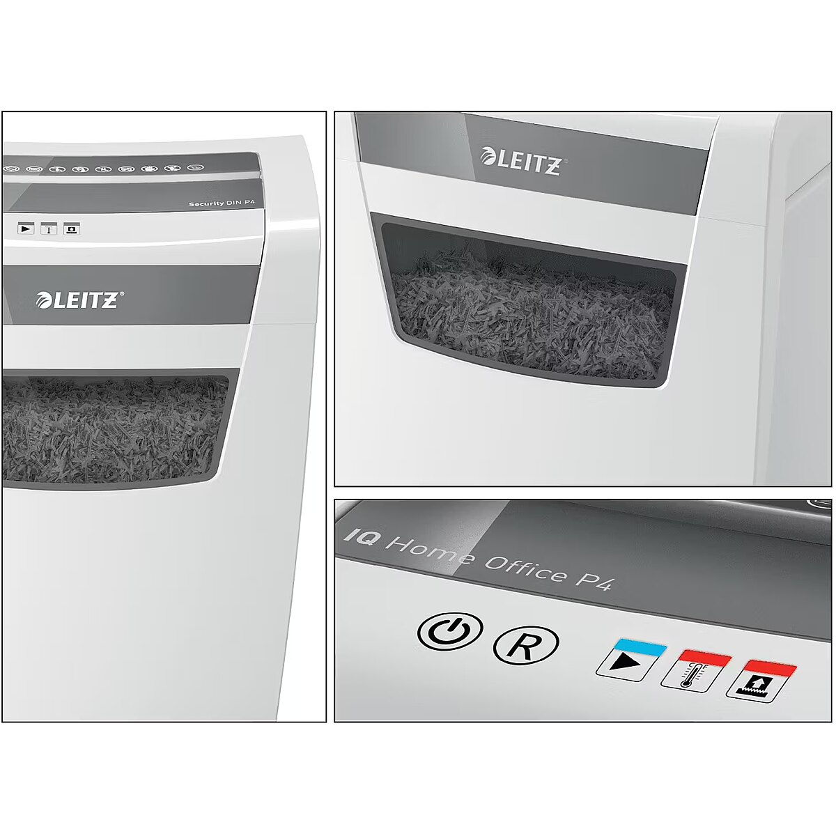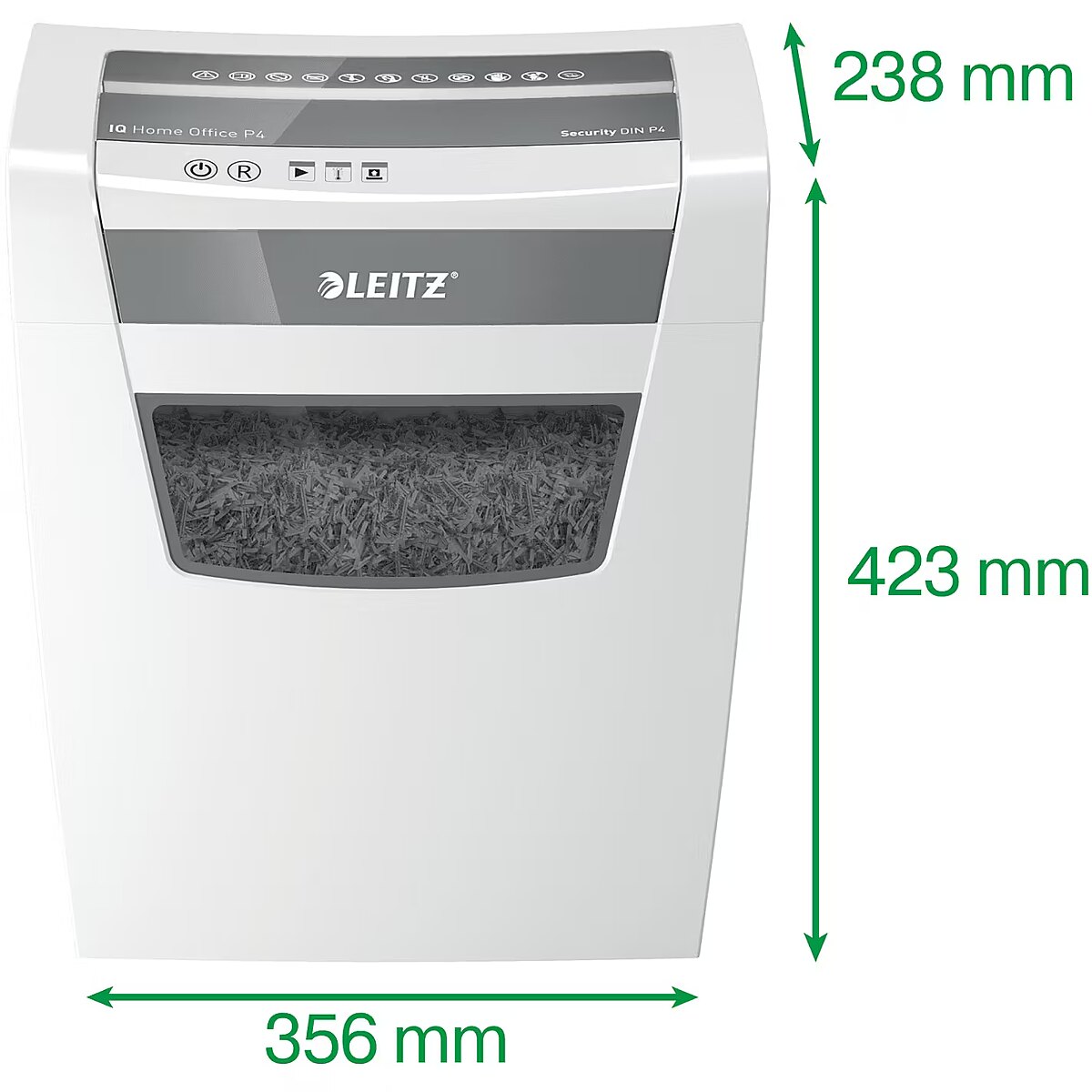 LongSummaryDescription - Leitz IQ Home Office Paper Shredder P4. Shredding type: Particle-cut shredding, Working width: 22 cm, Shredding size: 4 x 28 mm. AC input voltage: 220 - 240 V, AC input frequency: 50 / 60 Hz, Current: 0.8 A. Width: 356 mm, Depth: 238 mm, Height: 423 mm