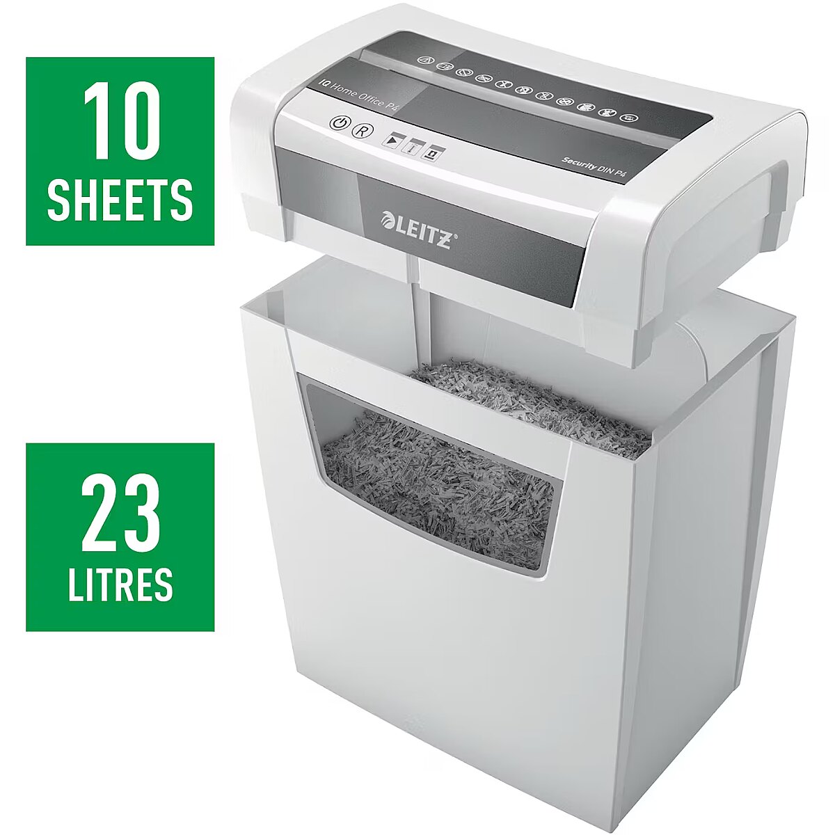 LongDesc - An exciting new stylish personal shredder from Leitz. Compact size for easy positioning, ideal for the home office user. Bring some style to your home office with this anti jam, quiet and long running shredder. Shred 10 sheets of A4 into the generous 23L bin with simple operation using touch controls. Increase the security in your document destruction with this Security DIN P4 shredder.