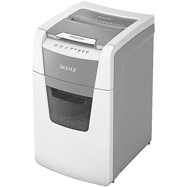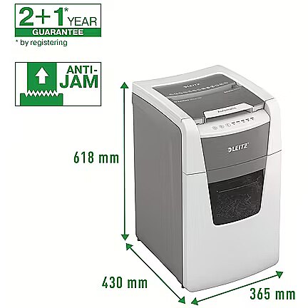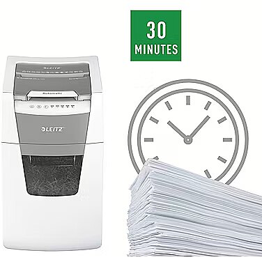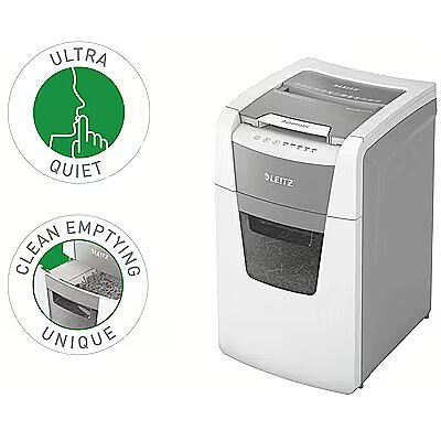 LongDesc - Fully automatic paper shredder from Leitz with unique clean emptying feature. So intelligent it quietly works on its own, just insert your stack of papers (incl. staples & paper clips), close the lid and get on with your day. Ideal for office use. Higher security and excellent performance with this anti jam, quiet and long running (30 min) autofeed shredder. Automatically shred 150 sheets of A4 into security P5 (2x15mm) micro cut pieces in one go into the generous 44L bin. Simple operation using touch controls.